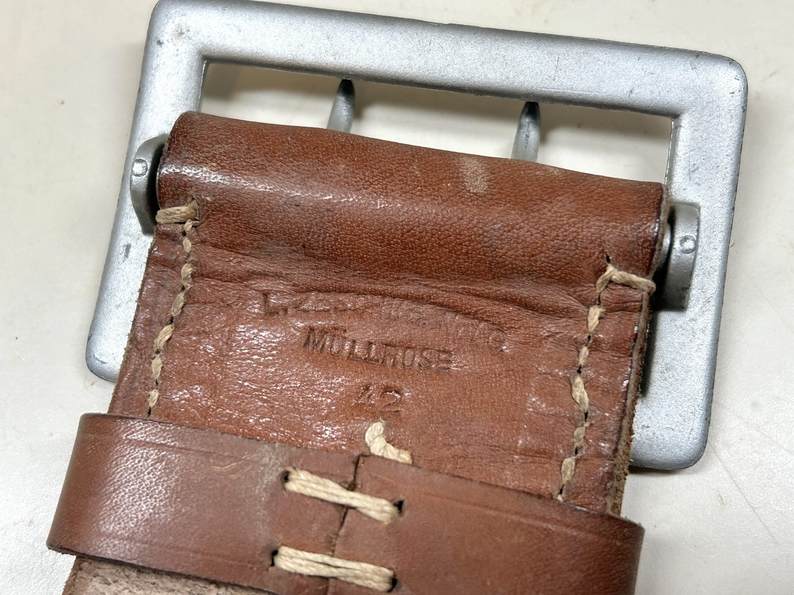 Beautiful 1942 dated Wehrmacht officer belt in dark brown color. The leather is still strong and supple and just looks great. Maker marked and dated 1942. Textbook example, this would look great on a Luftwaffe or Army Officer mannequin.