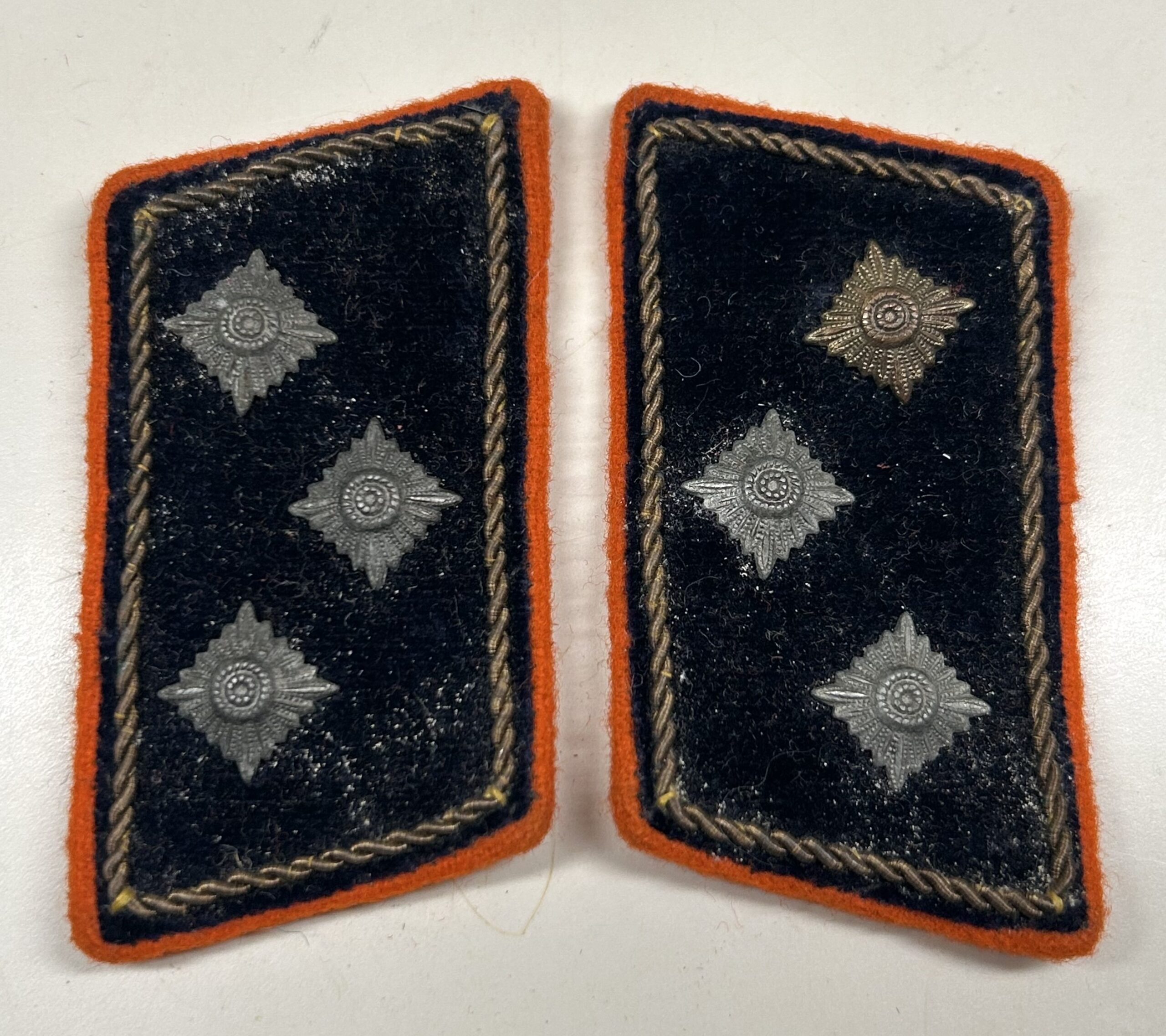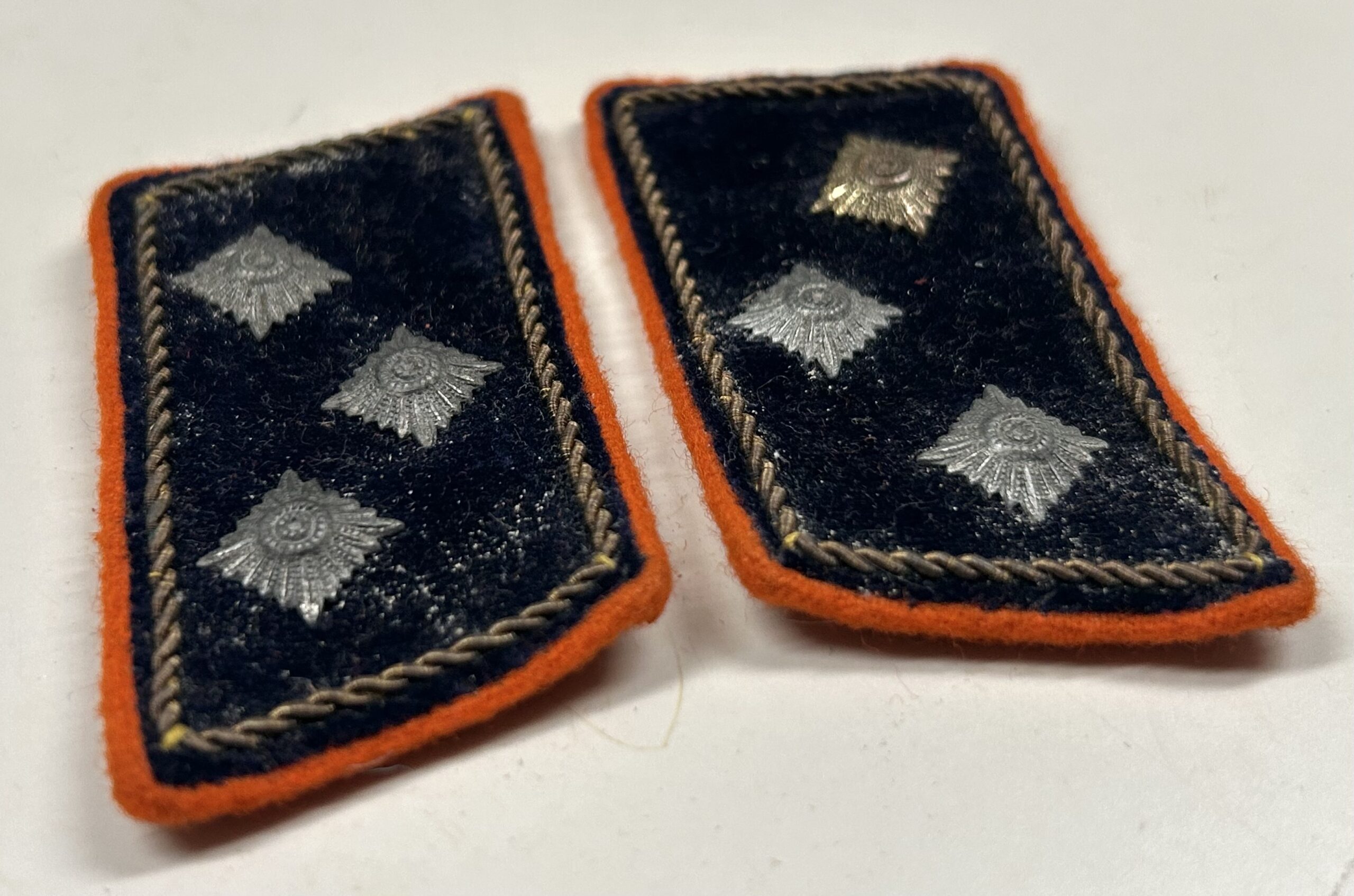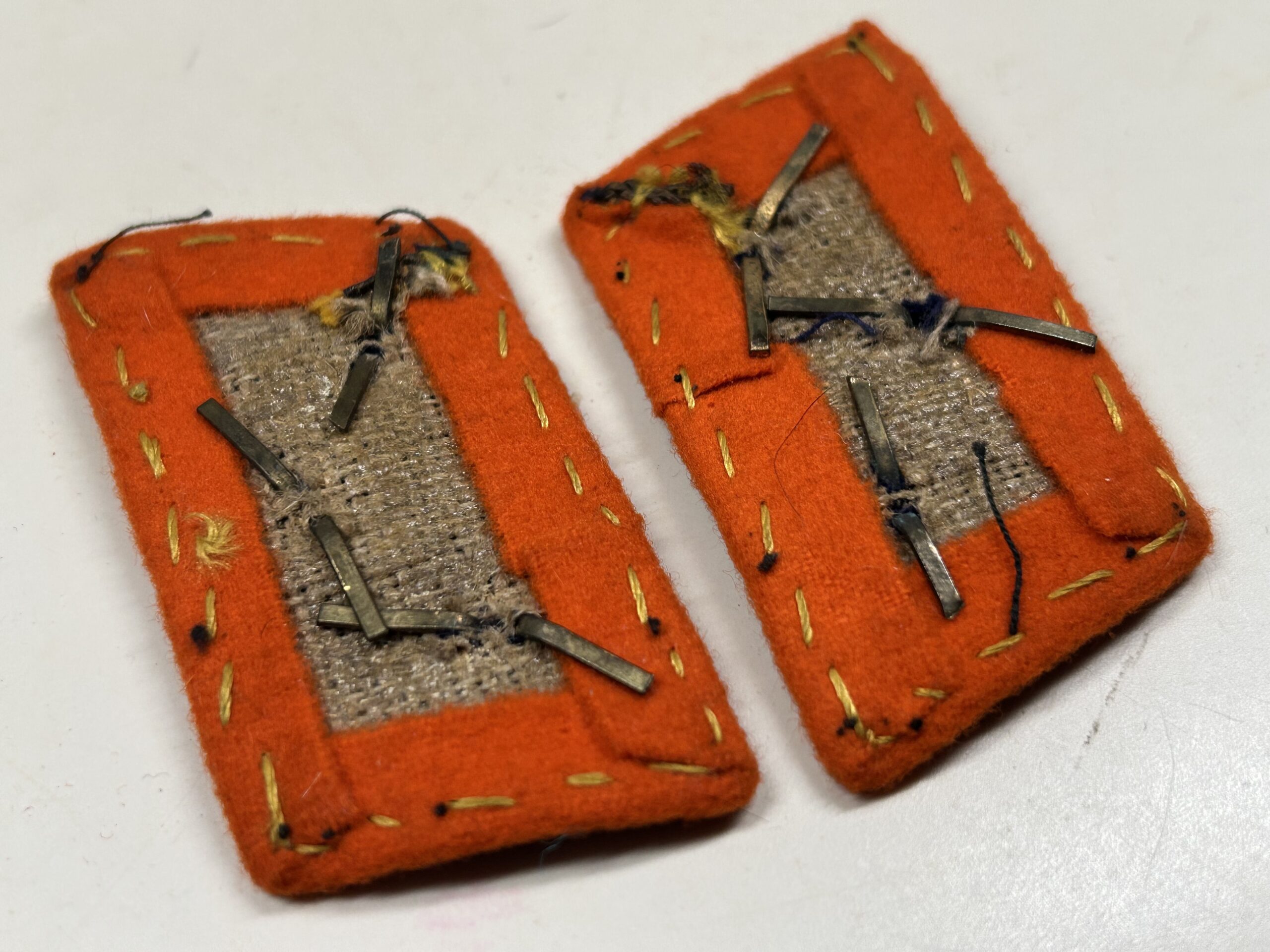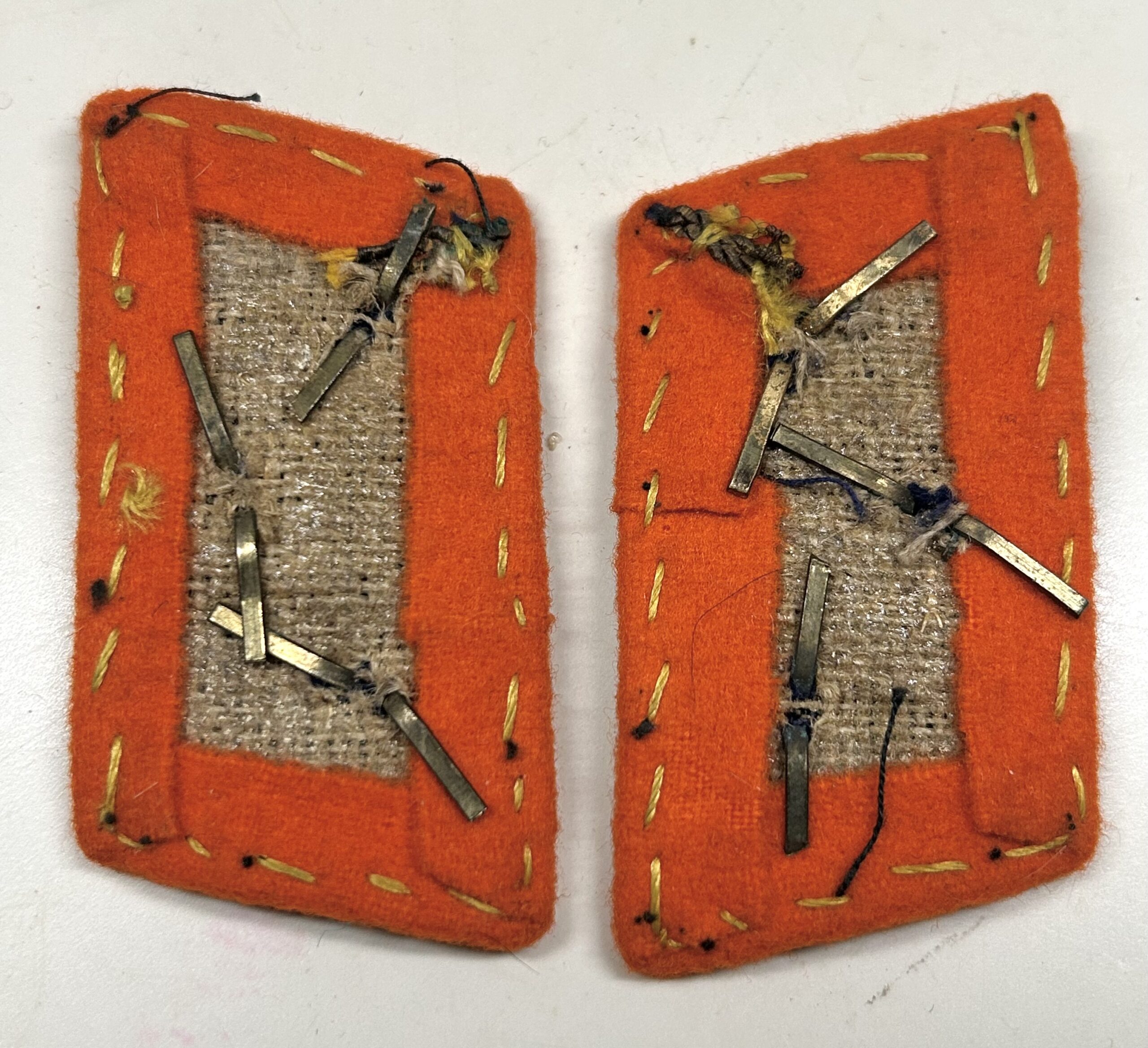 As with most nations, the German national postal service was a uniformed organization, whose uniform regulations were altered shortly after the NSDAP achieved political power in January of 1933. This matched set which was uniform removed is constructed with dark blue wool collar tabs, piped in orange with three rank pips for the rank of Postsekretar.