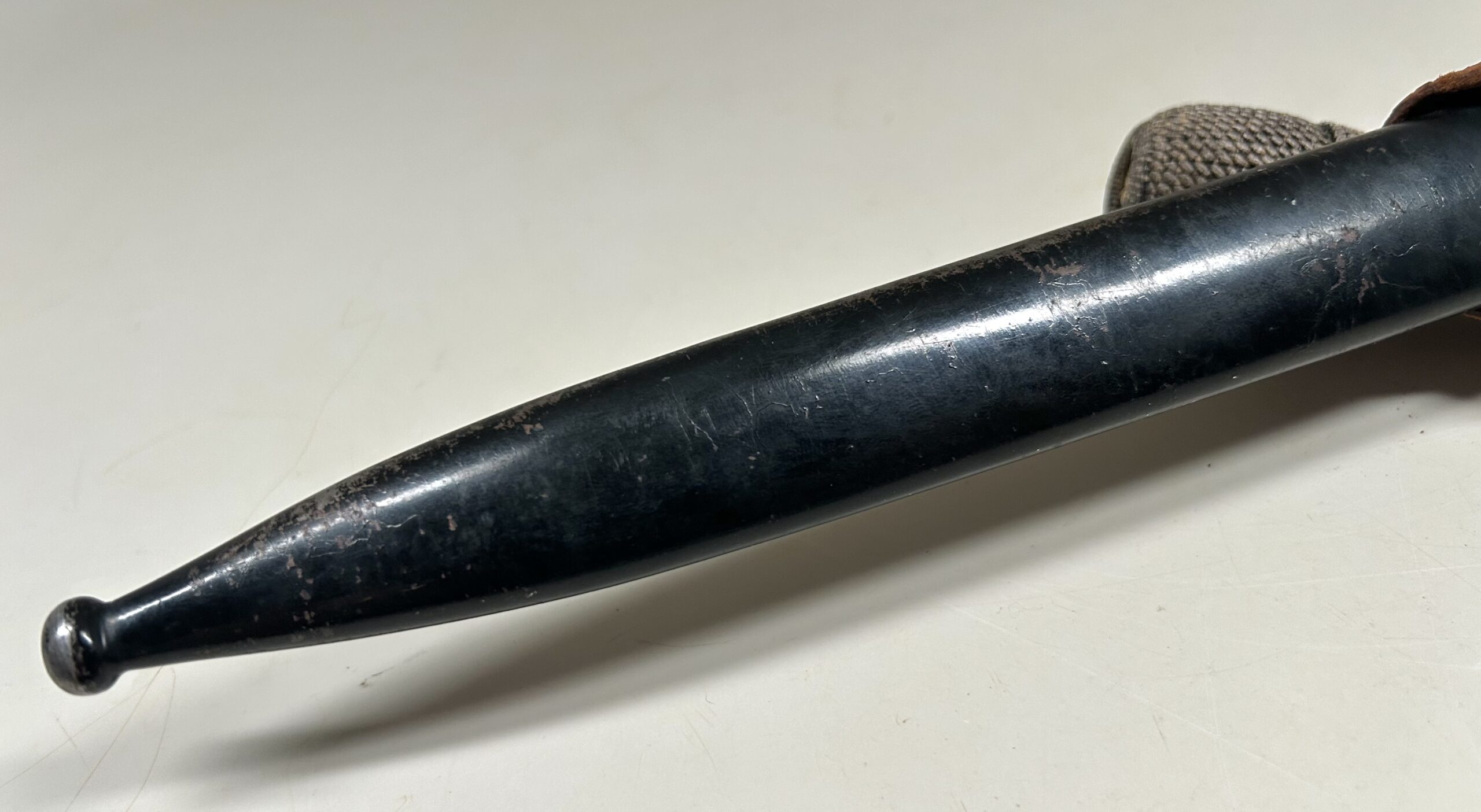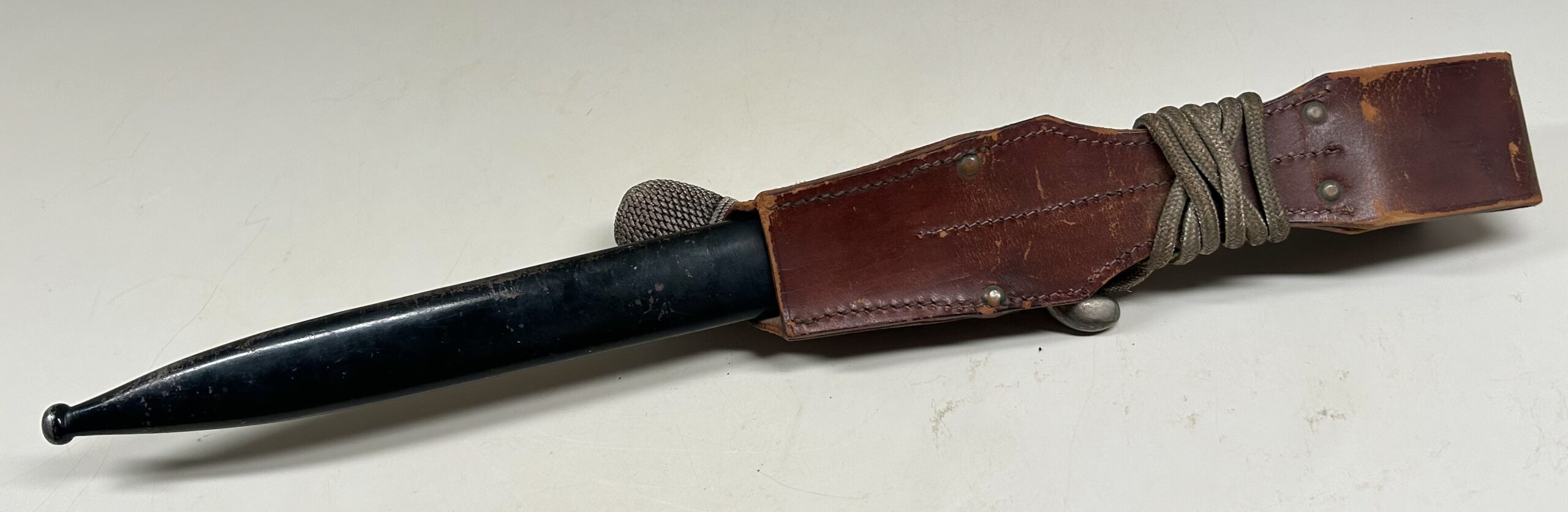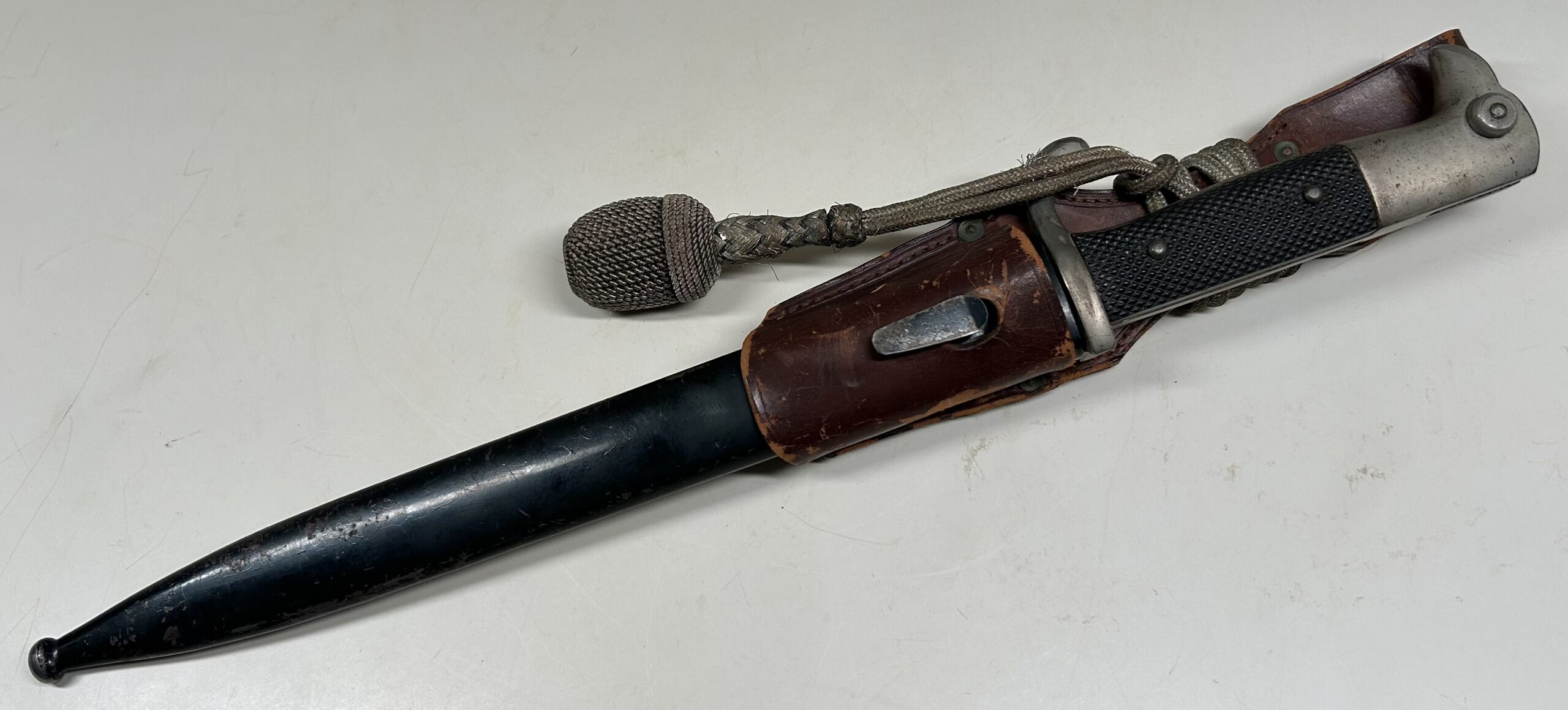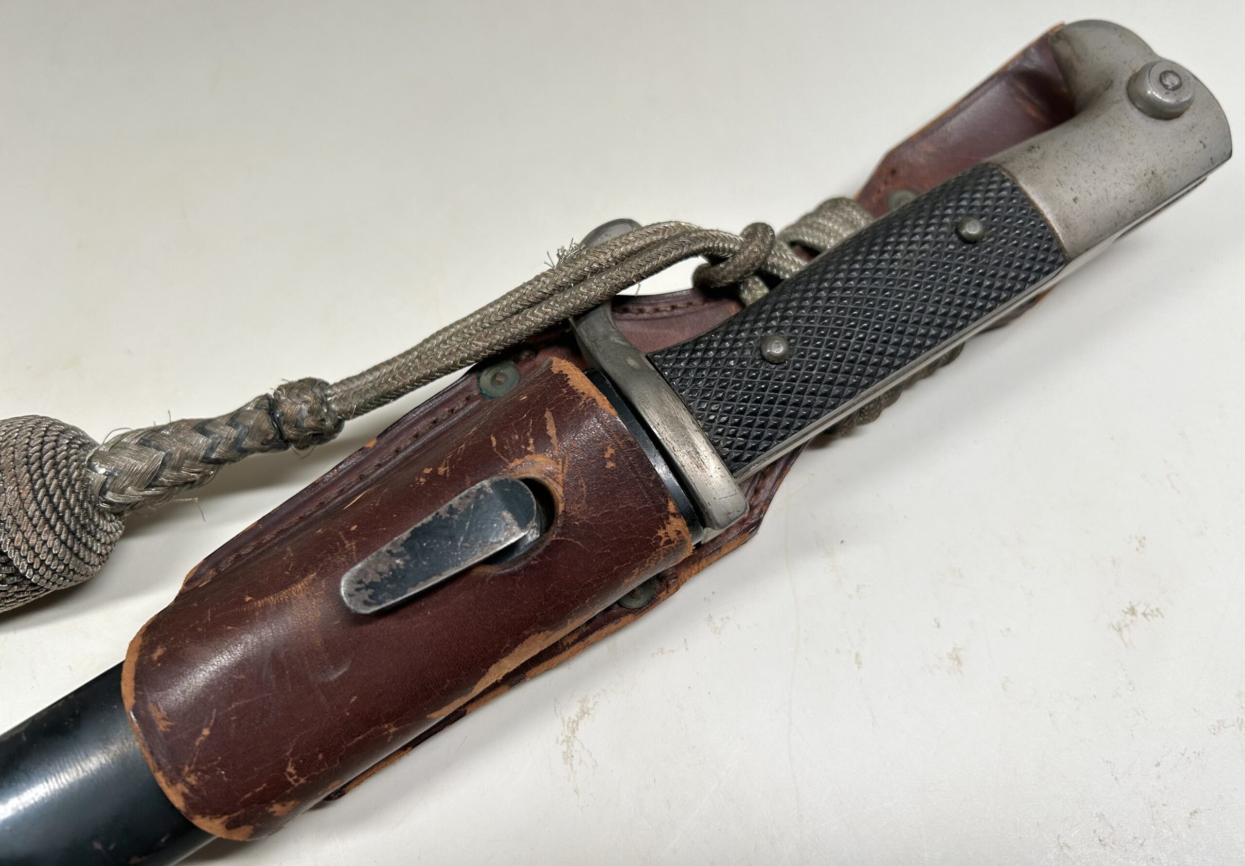 Very early long K98 dress bayonet as produced by WKC. Dual 1930’s era makers mark with King and Knight, these are very hard to find. No dents in scabbard, the blade is bright also. The set is complete with early brown leather frog and original portepee. Great early long bayonet!