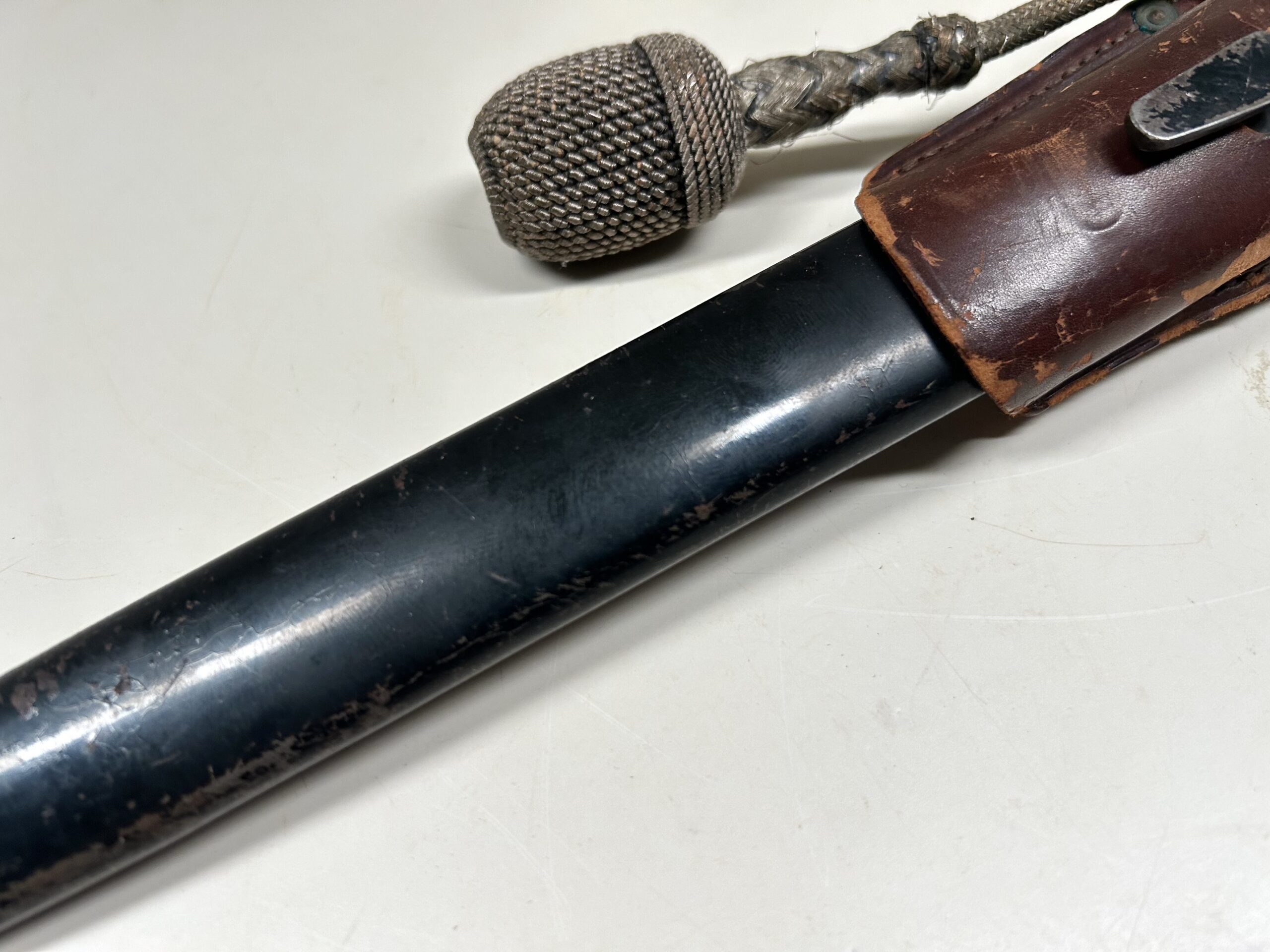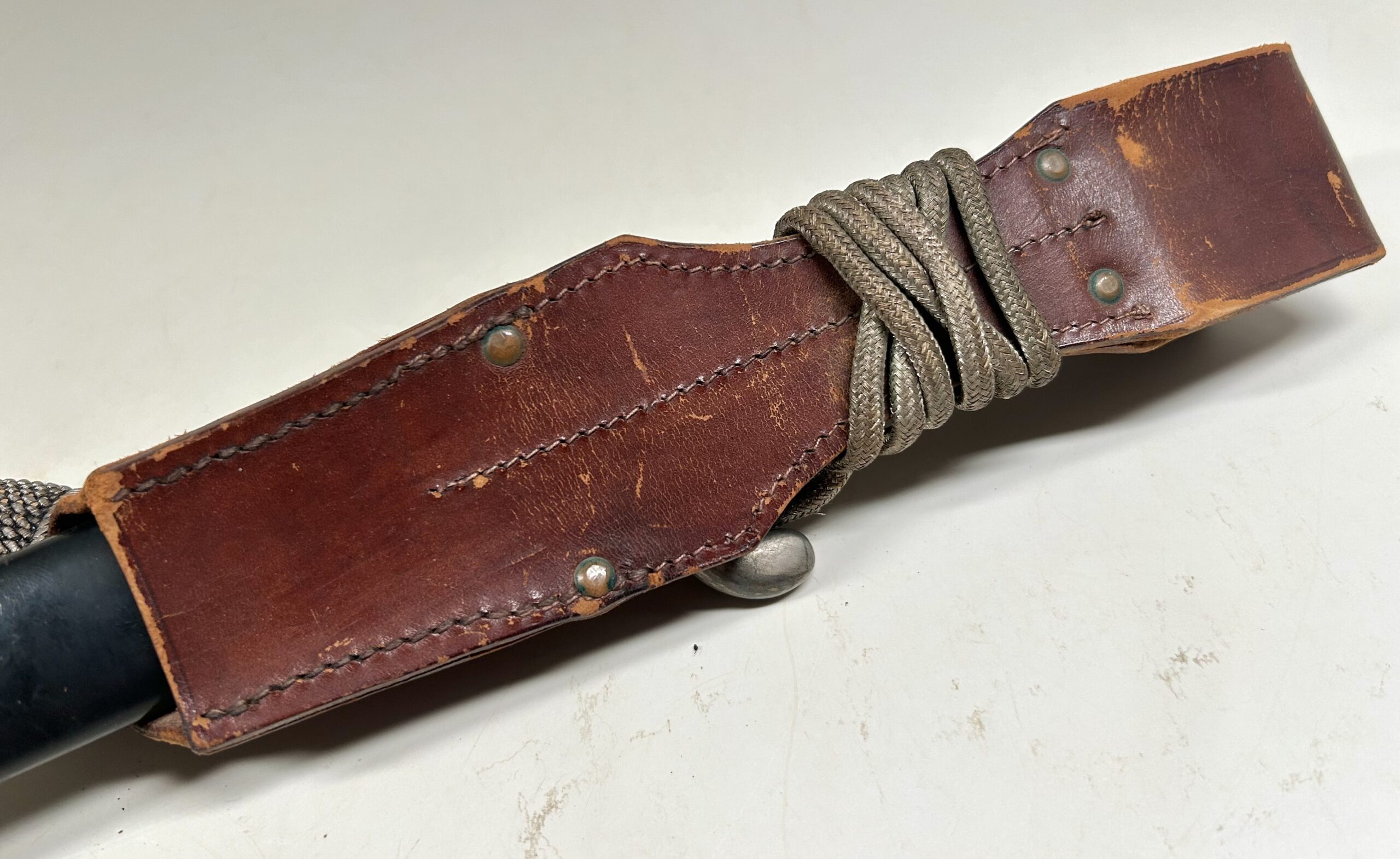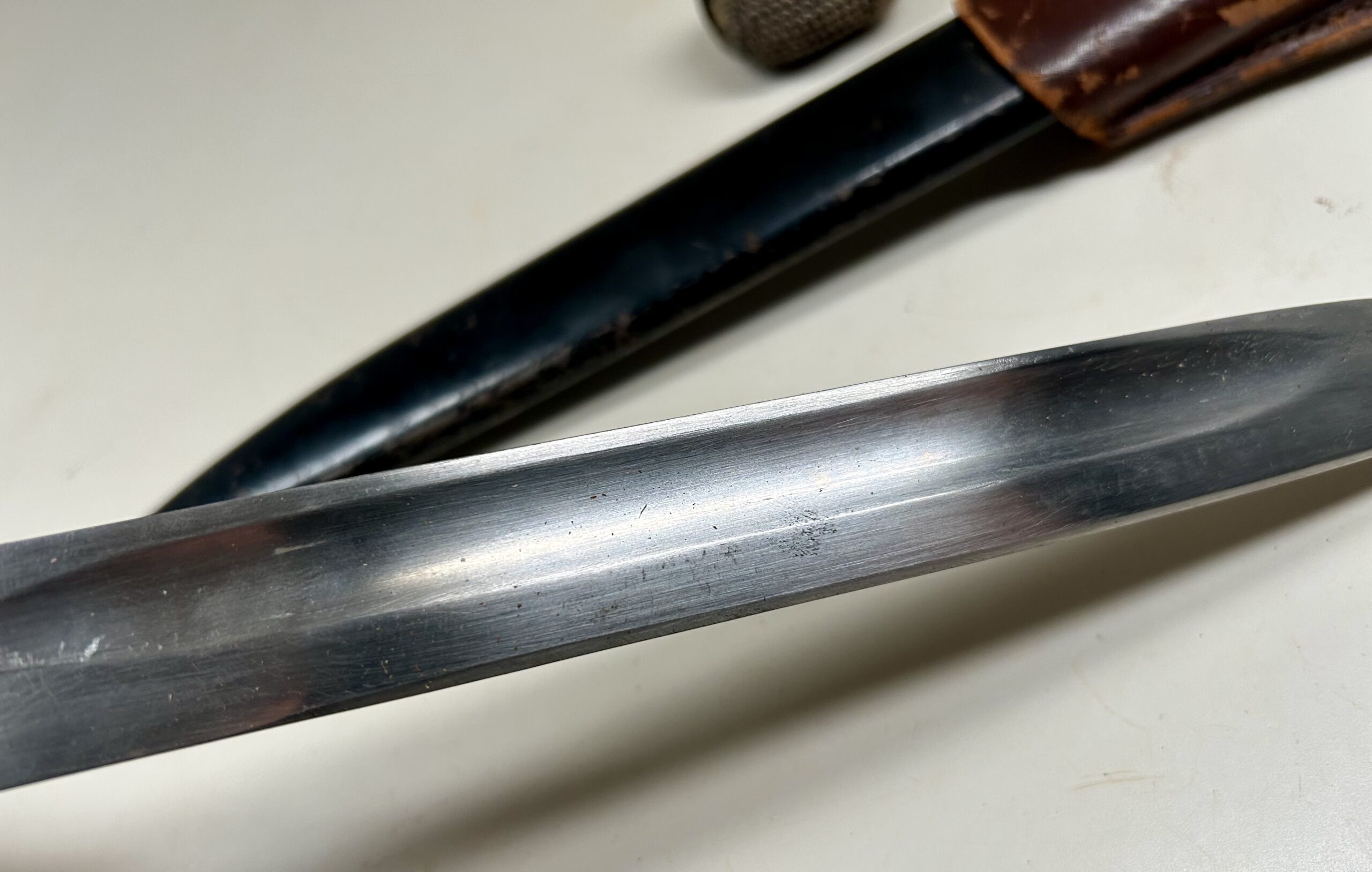 Very early long K98 dress bayonet as produced by WKC. Dual 1930’s era makers mark with King and Knight, these are very hard to find. No dents in scabbard, the blade is bright also. The set is complete with early brown leather frog and original portepee. Great early long bayonet!