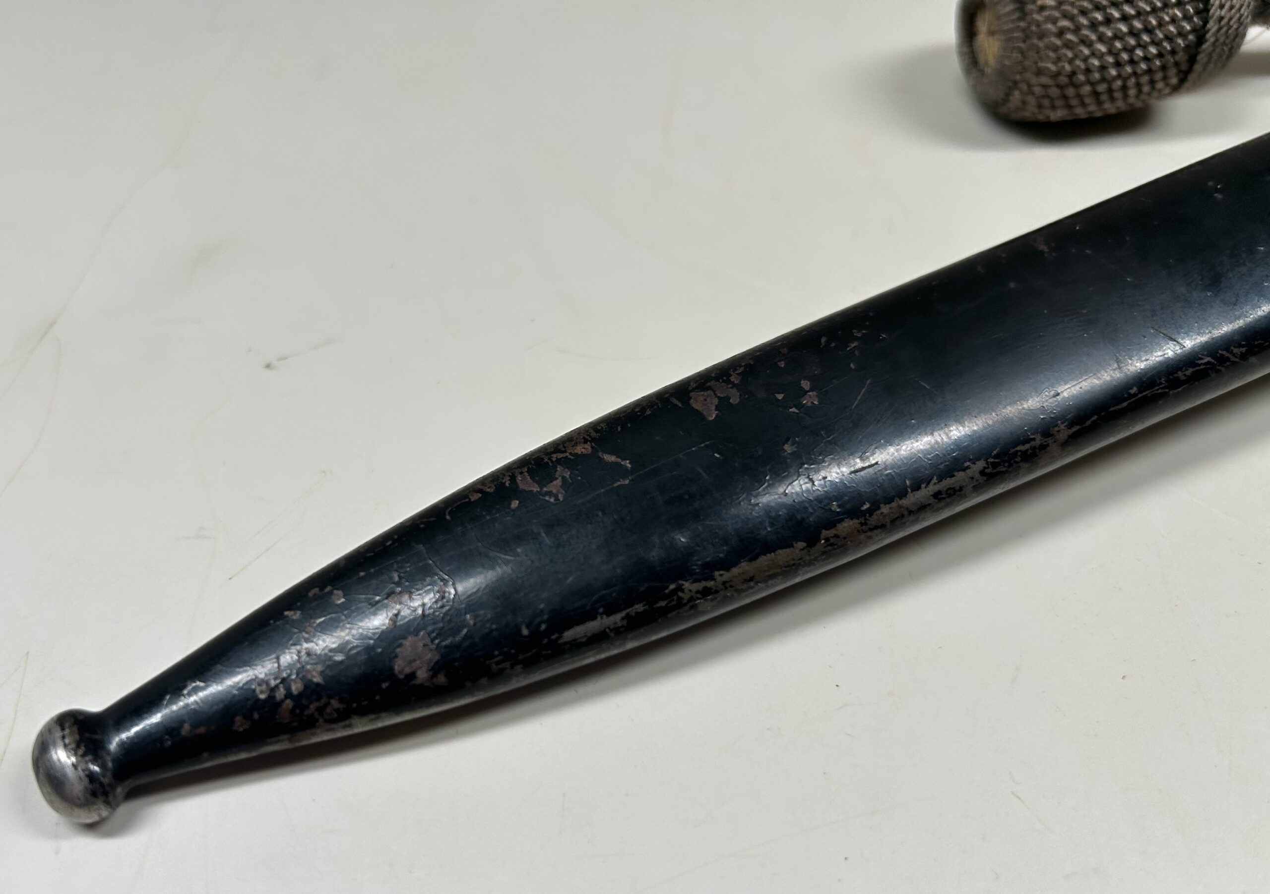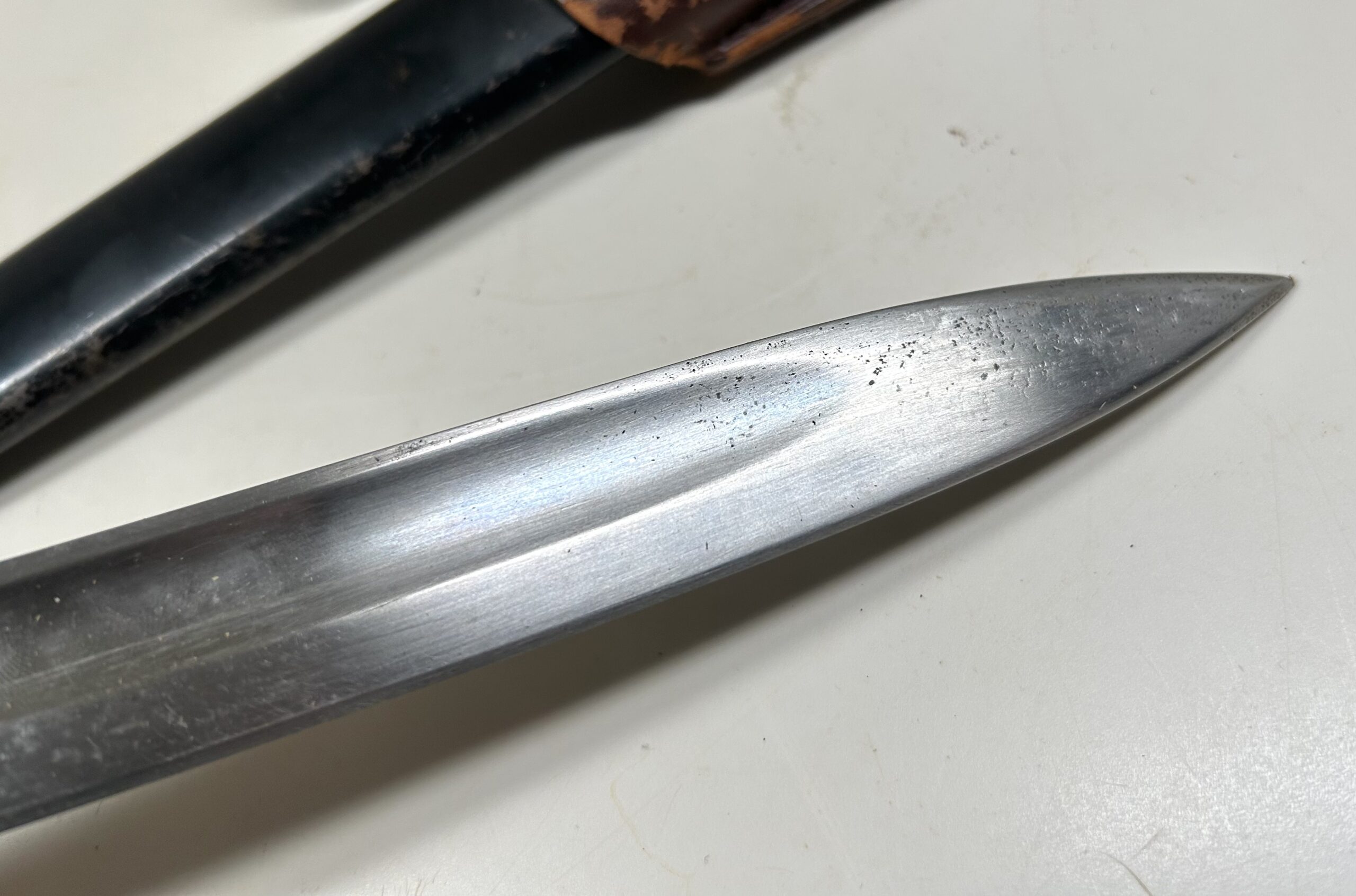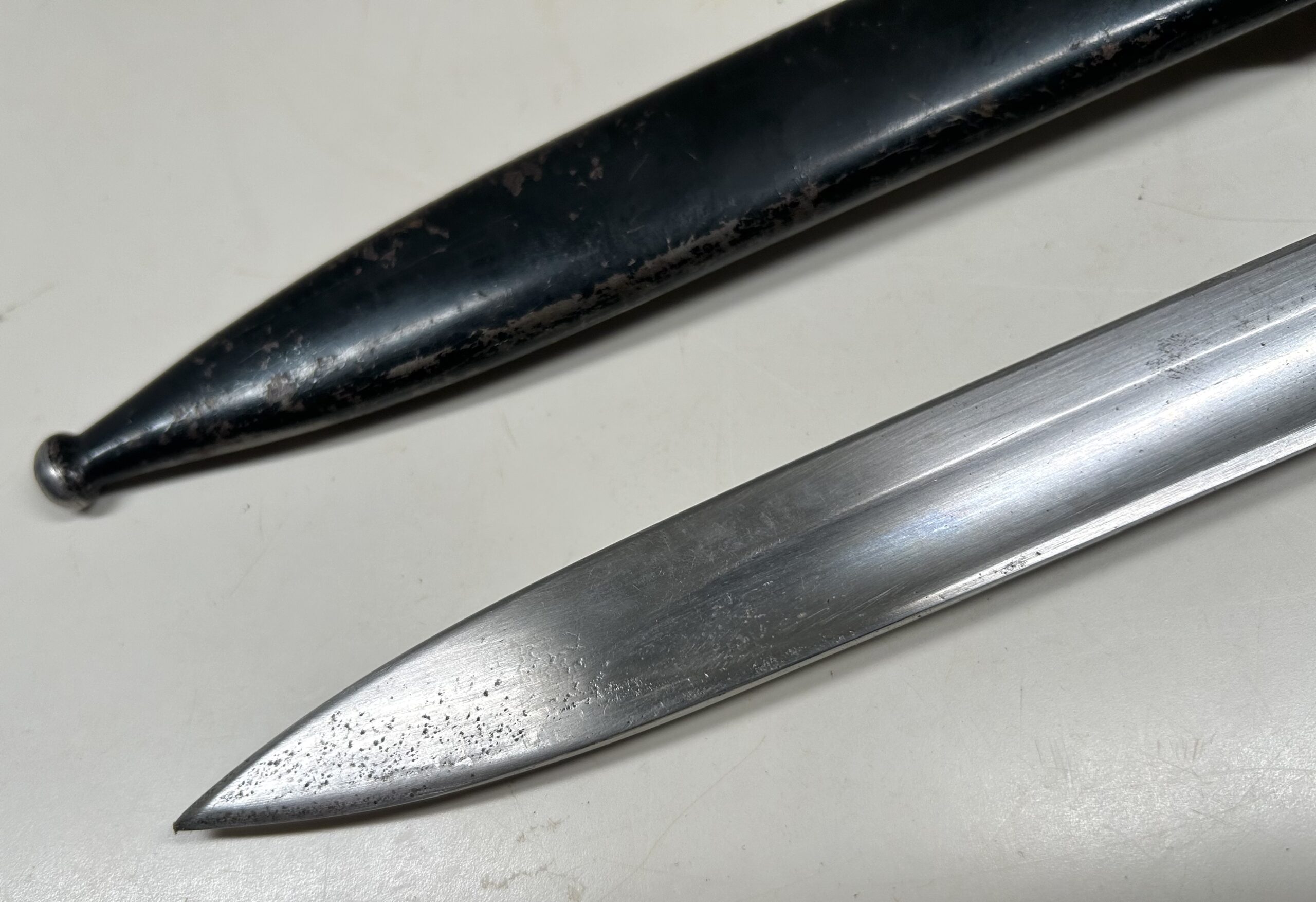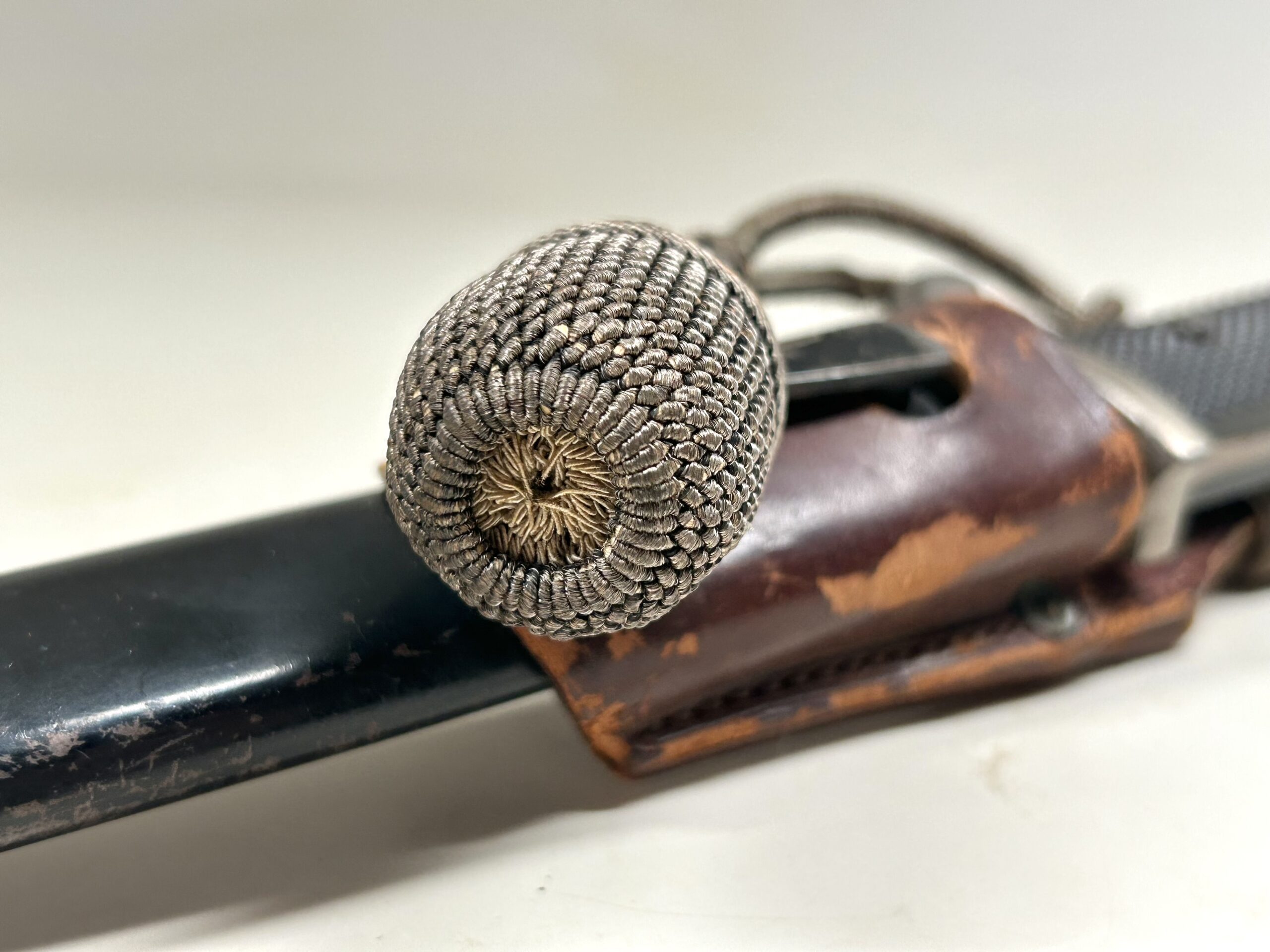 Very early long K98 dress bayonet as produced by WKC. Dual 1930’s era makers mark with King and Knight, these are very hard to find. No dents in scabbard, the blade is bright also. The set is complete with early brown leather frog and original portepee. Great early long bayonet!