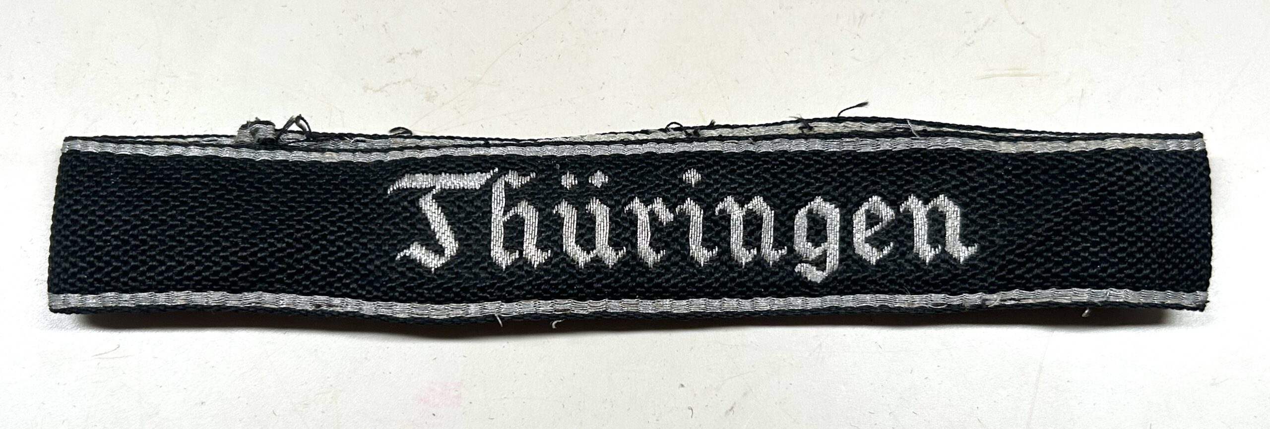 Early pre war flat wire woven style cufftitle with silver wire borders and Thüringen in gothic script. Remains in uniform removed condition and has a killer look! Shows some wear and some slight separation of the silver border due to removal, the original early black cloth RZM tag is still intact. Good looking and sought after cufftitle that was worn on the black Totenkopfverbänd uniform by one of the earliest of SS members!