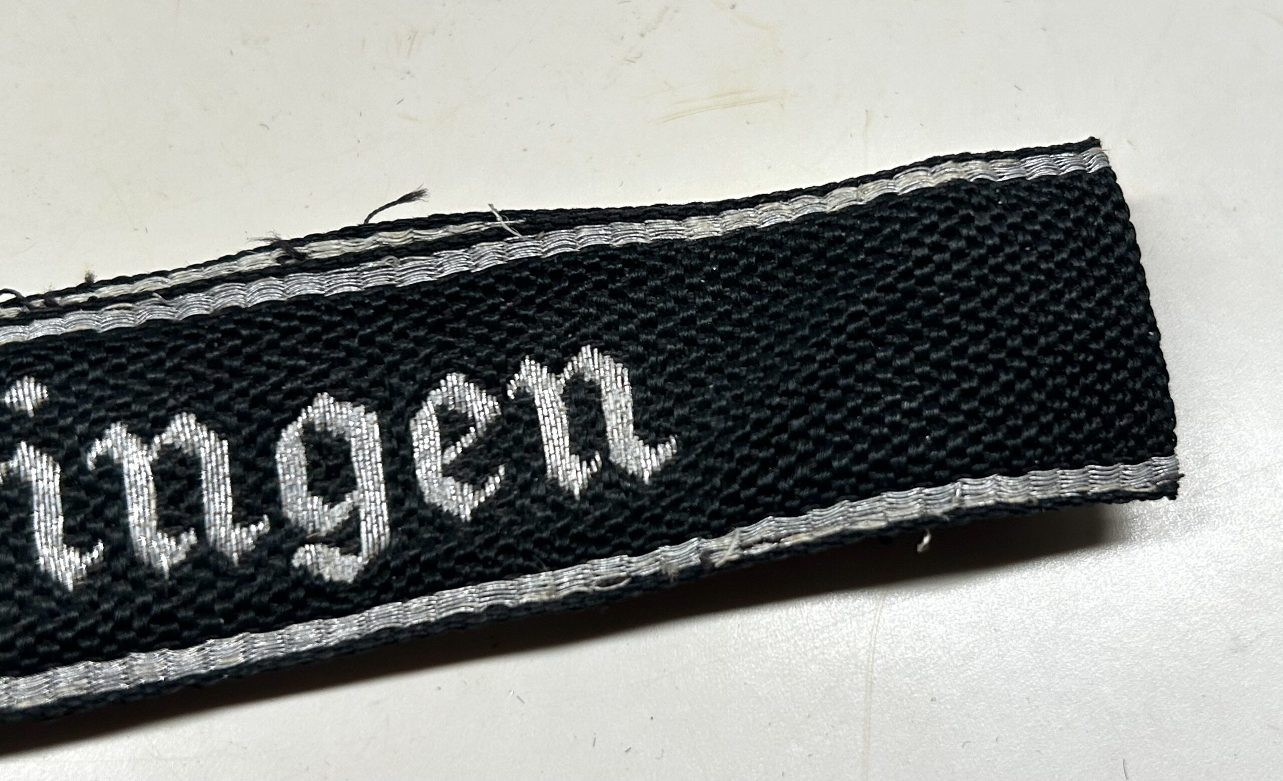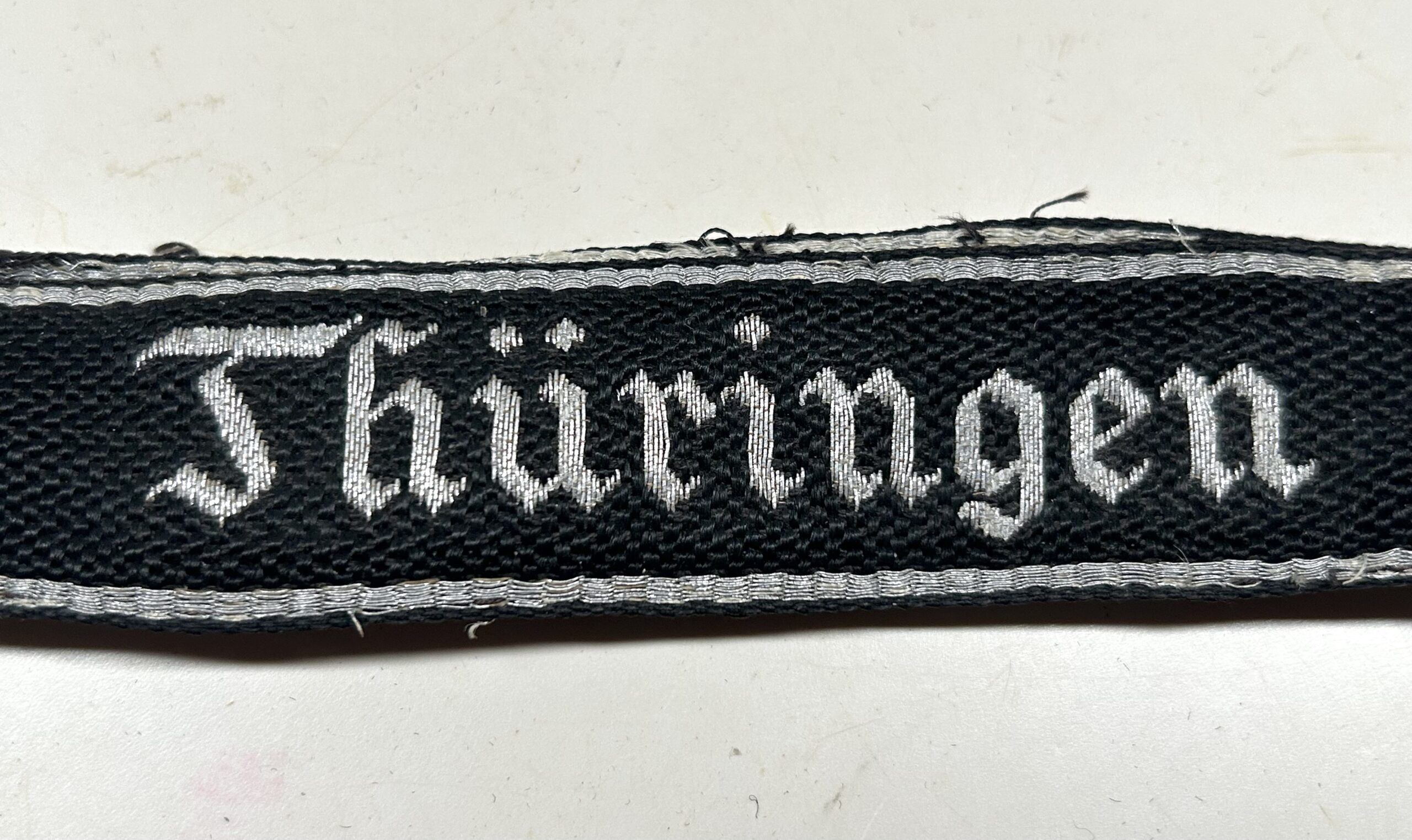 Note – The 3rd SS-Totenkopfstandarte “Thüringen” was formed by merging SS-Wachsturmbann (Guard Battalion) “Elbe” and SS-Wachsturmmbann “Sachsen”. The members of this regiment were issued cuff titles embroidered with “THÜRINGEN” in gothic script. This cuff title was also worn by the staff of the Commandant of Buchenwald concentration camp.
