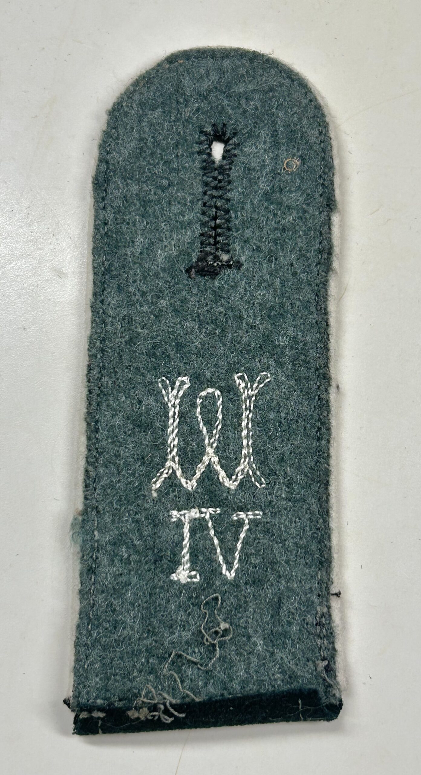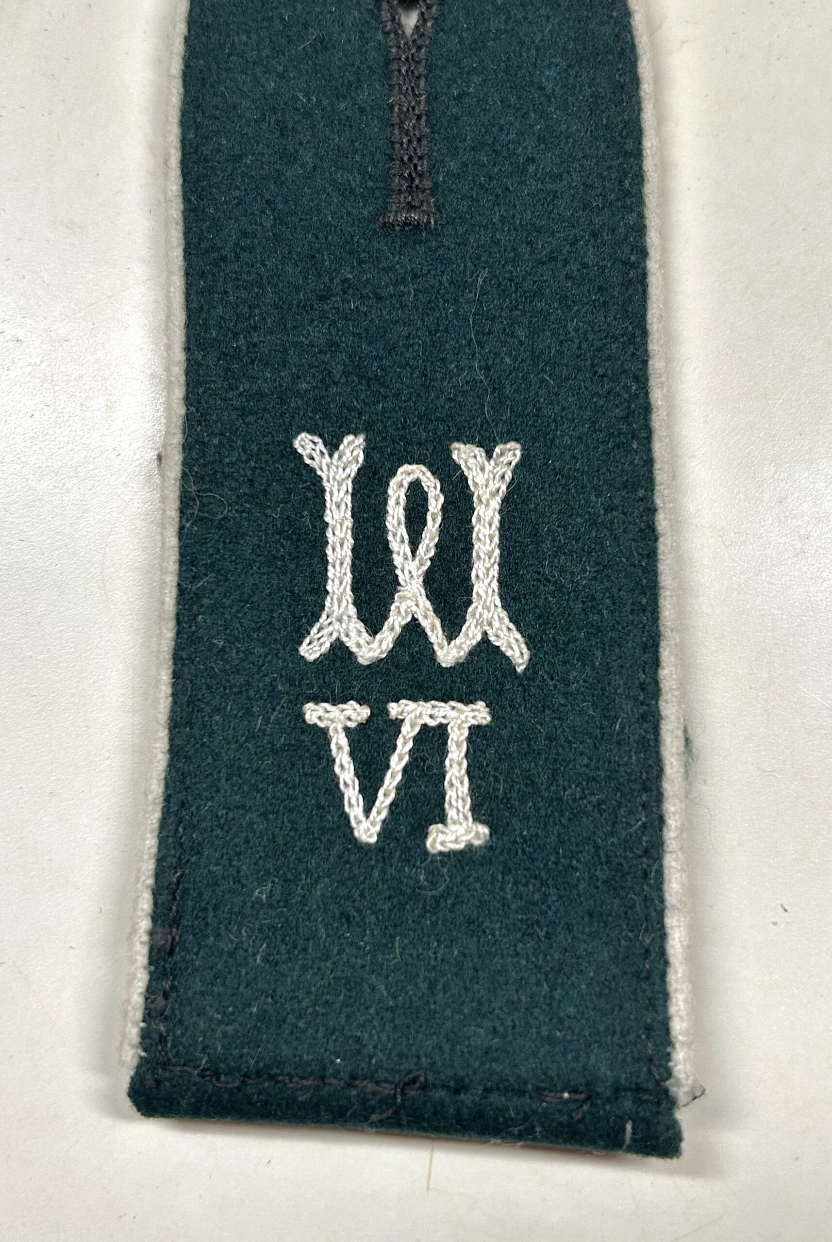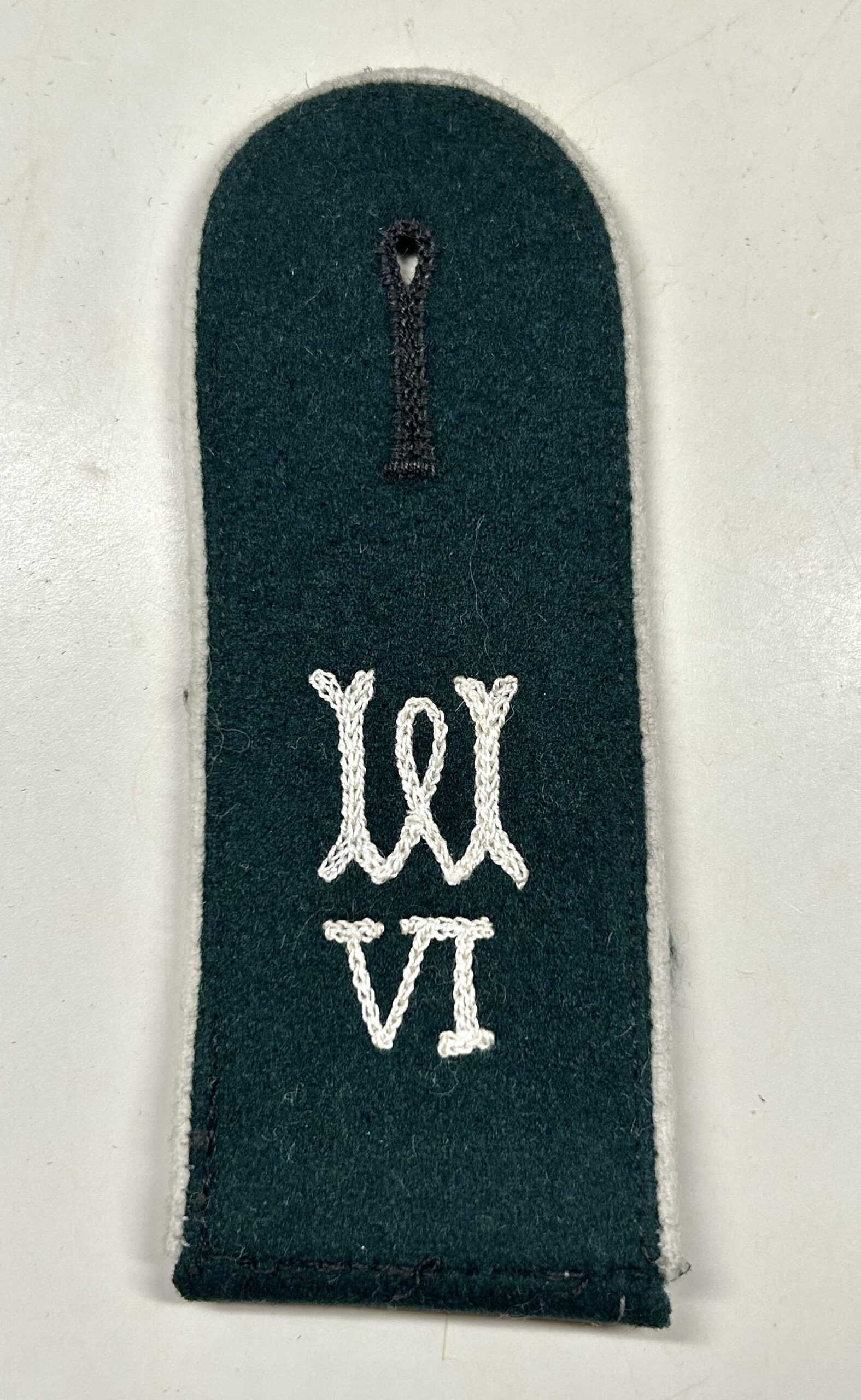 Very nice, early m36 shoulderboard as worn by a Heer (Army) enlisted man in the Wehrersatzdienststelle (Recruiting Offices.) dark green base with white color piping, the board has an embroidered “W” as well as the Roman numerals underneath for region 6. Great piece of early insignia typically missing from most collections.