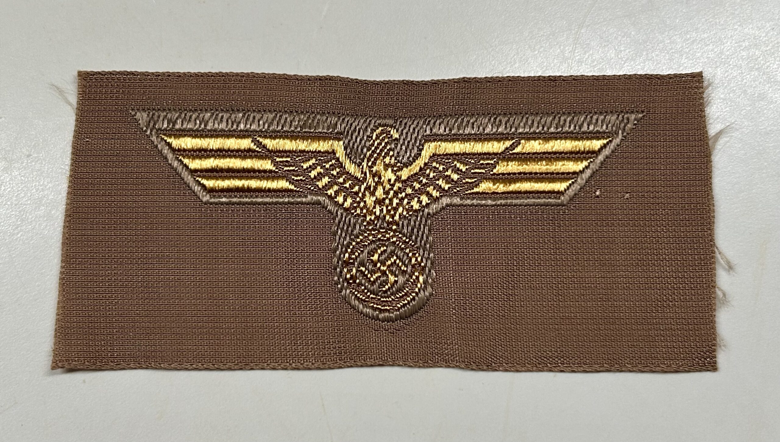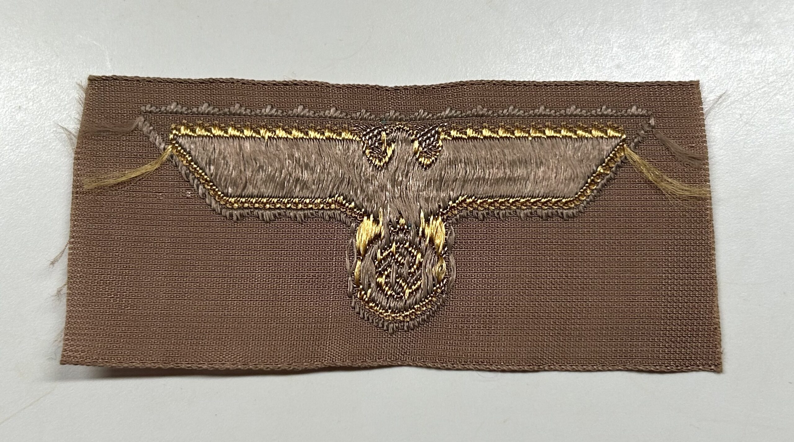 Standard Kriegsmarine (Navy)  tropical ‘Afrikakorps’ cap eagle. Gold flat woven ‘BeVo-weave’ example on tan colored backing. Very hard to find compared to most cap eagles.