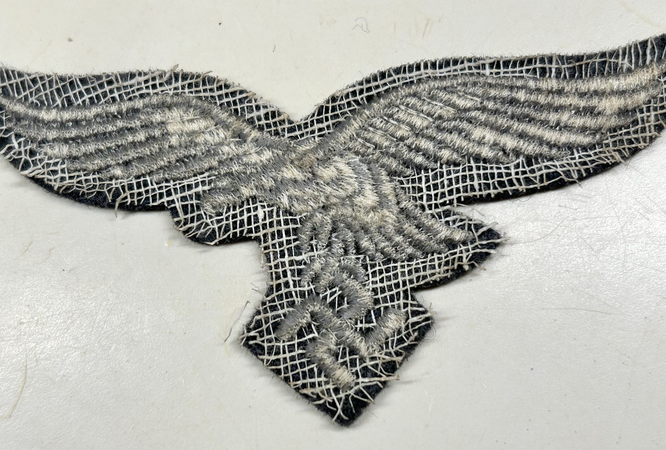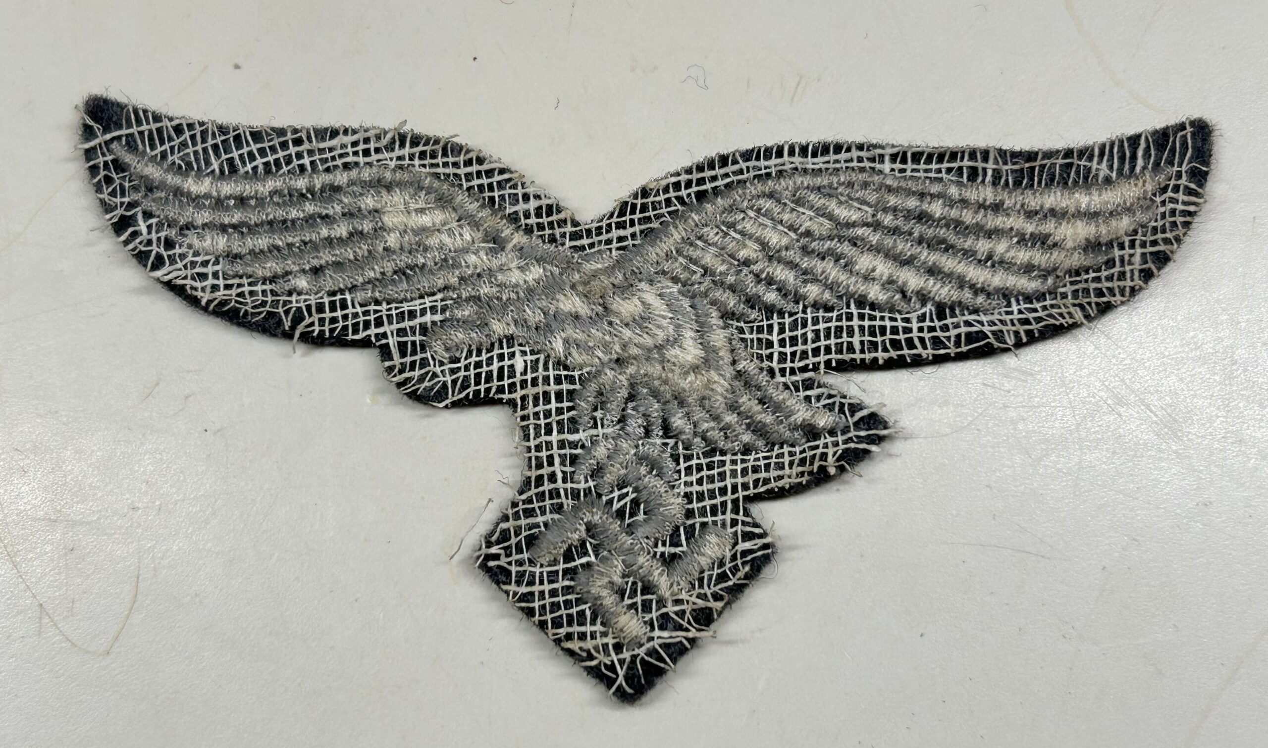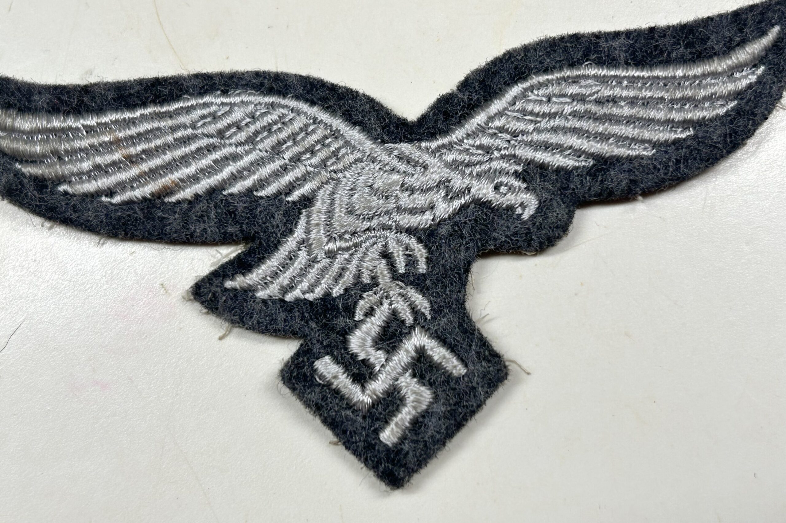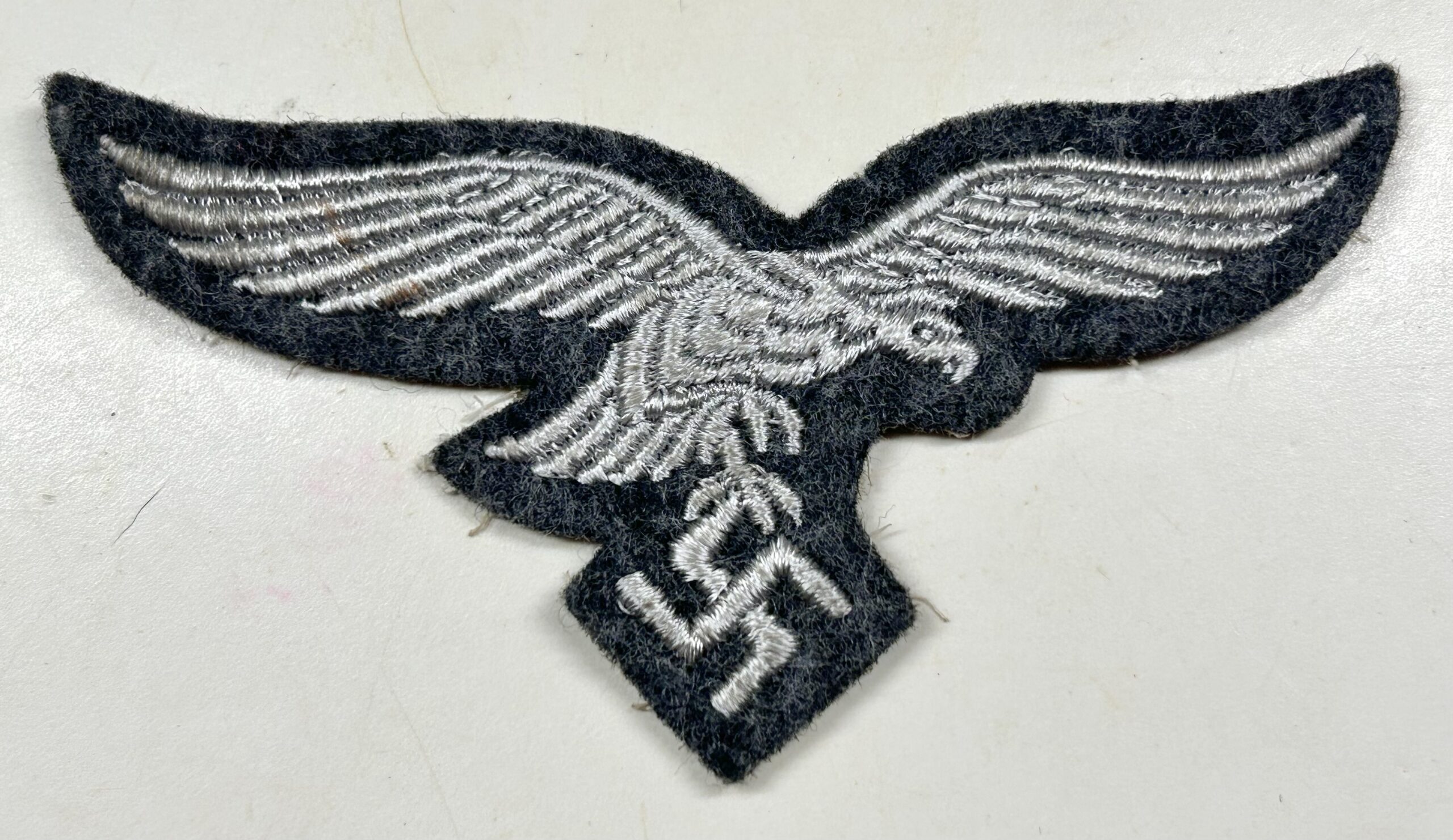 Mint, unissued Luftwaffe breast eagle as worn by Enlisted Men and NCO’s. Machine embroidered eagle in white thread on blue felt with white cheese cloth backing. Textbook example, to be worn on a Luftwaffe fliegerbluse. Great eagle for a uniform restoration, or for someone looking for the best condition possible!