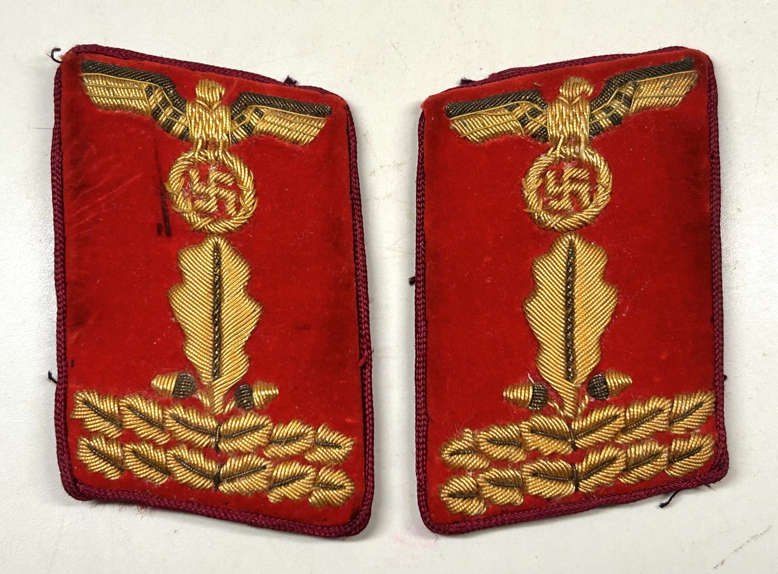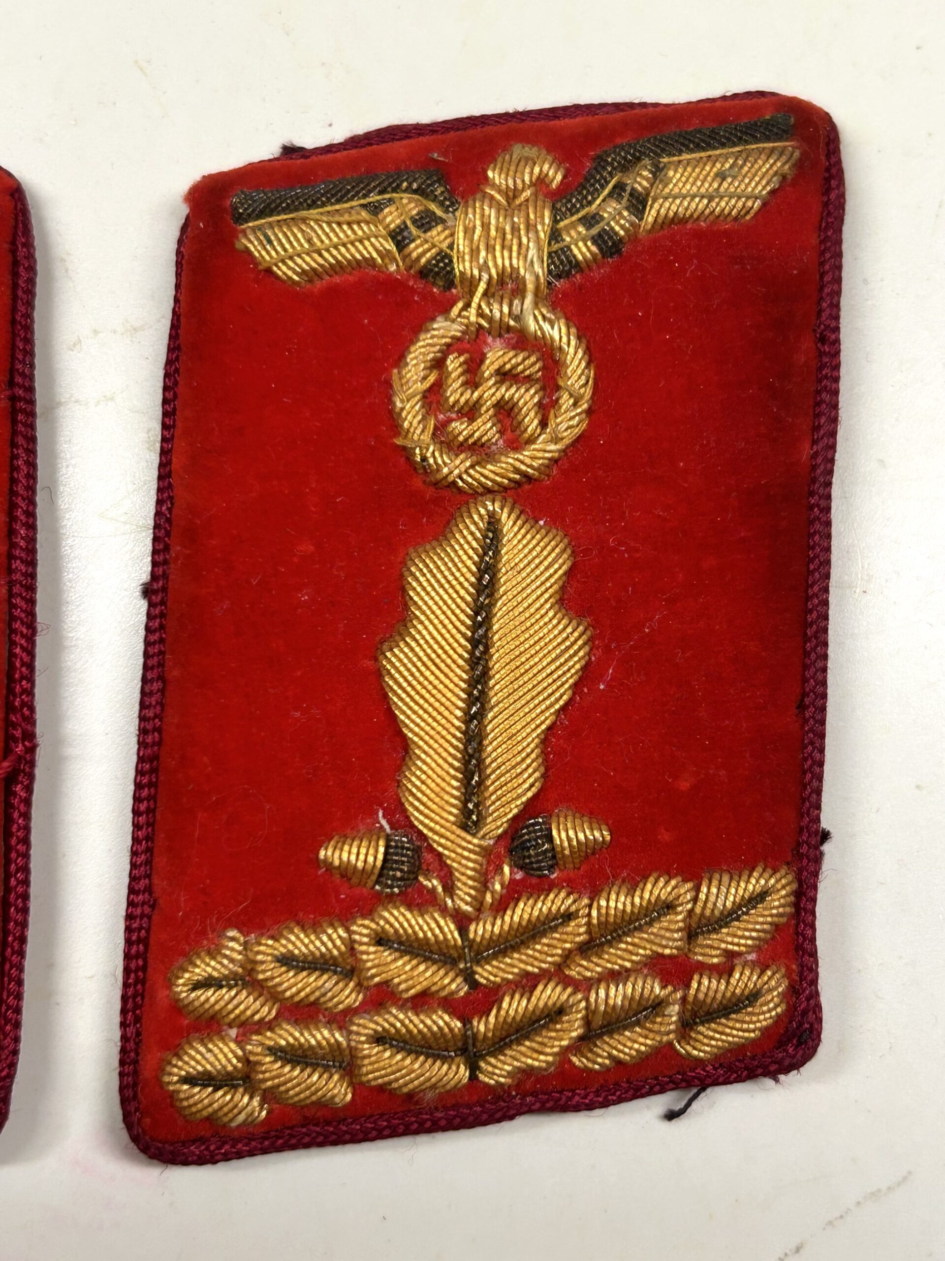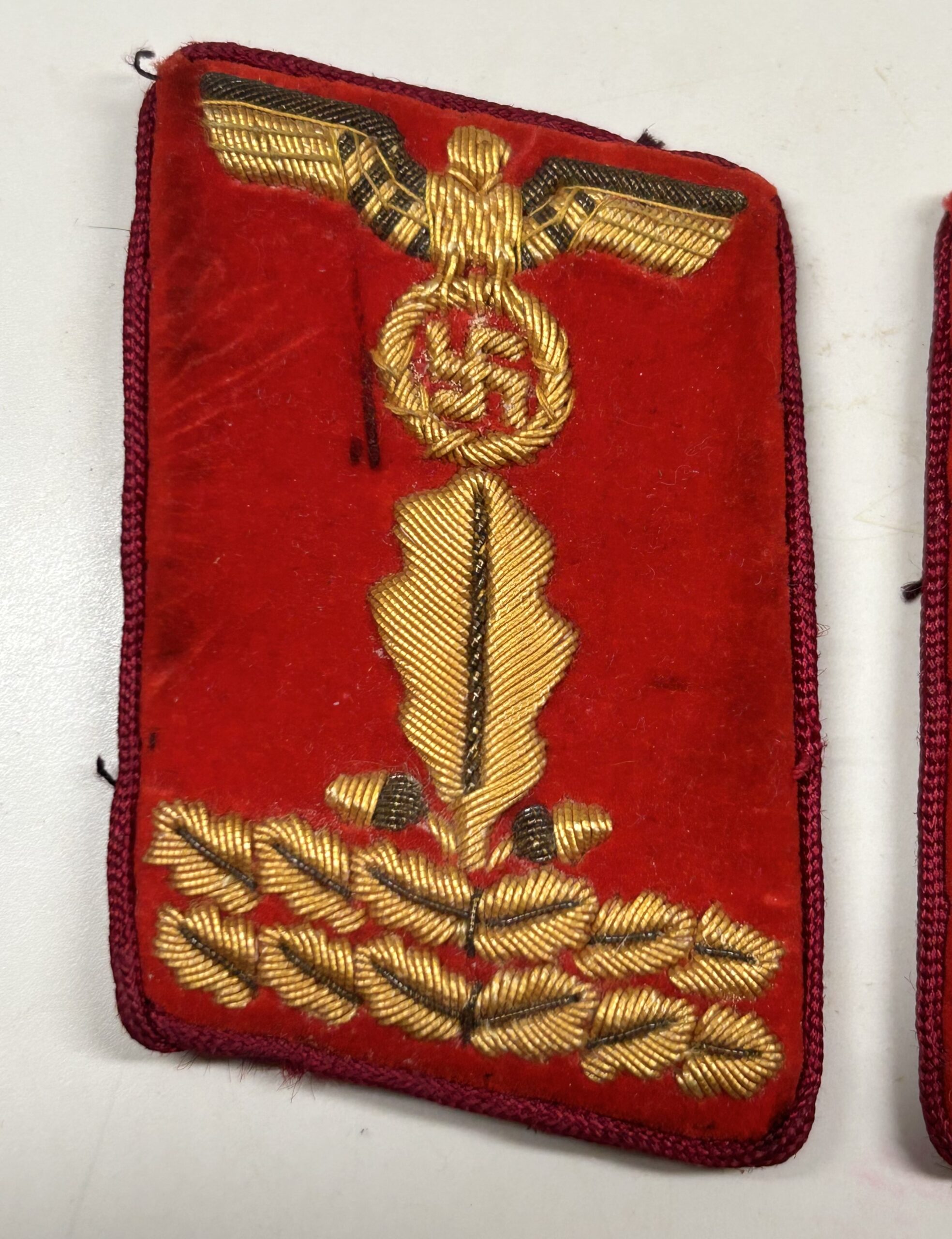 Incredible, and very sought after matched set of uniform removed collar tabs for a high ranking member of the NSDAP at the Gau Level (Gauleitung) with the rank of Gauleitung Hauptabschnittsleiter. These tabs are construction on a red velvet base, with dark red rayon piping. The tabs features a hand embroidered gold celleon national eagle clutching a wreathed, static swastika in its talons, as worn between 1939-45. Beneath the eagle is a single oak leaf, with an acorn to either side of its base, and double horizontal sprays of oak leaves. This combination indicates an “Haupt-AbschnittsLeiter” rank. Original RZM tag is still attatched, and there are clear sings of being worn during the period. Rare & nice set!