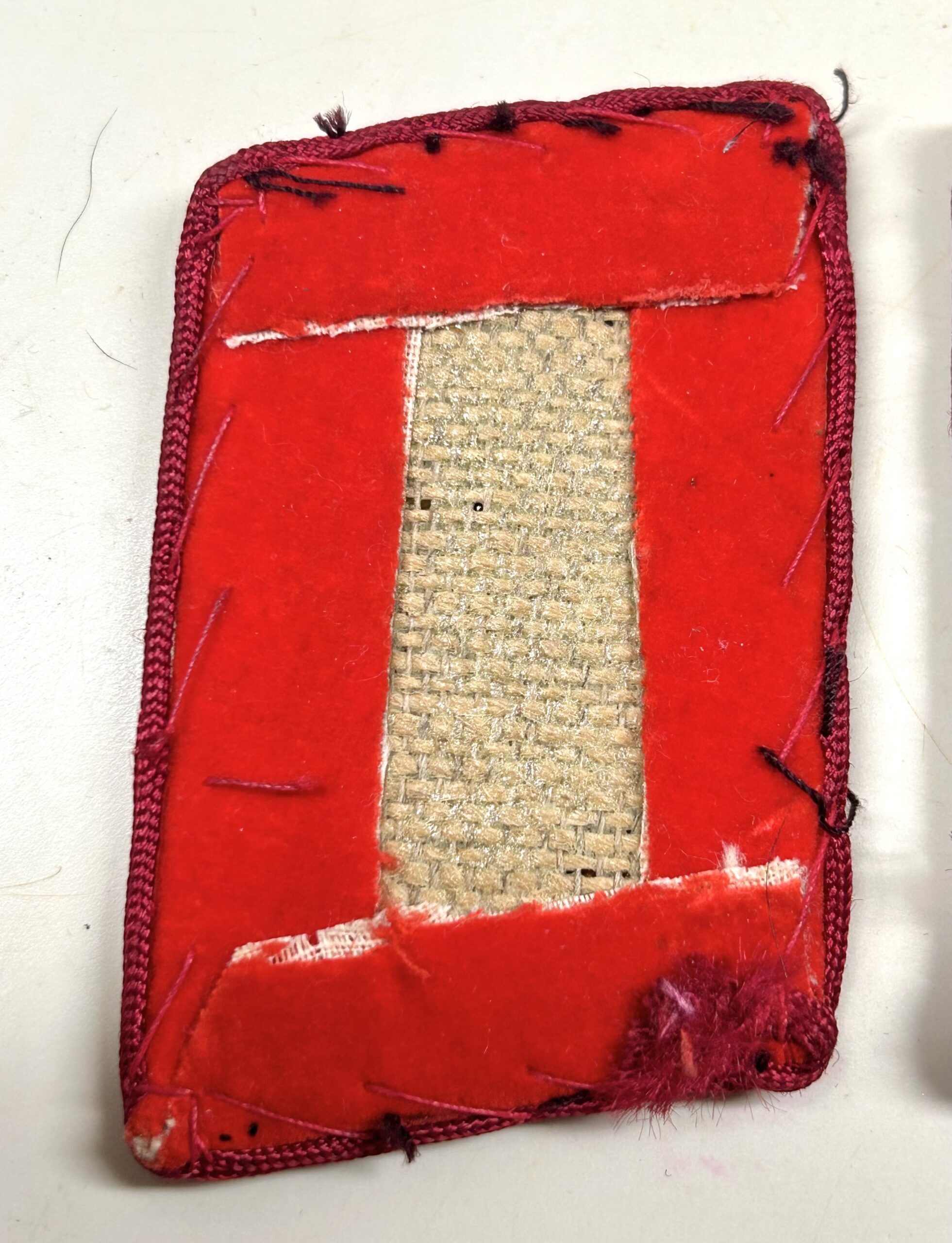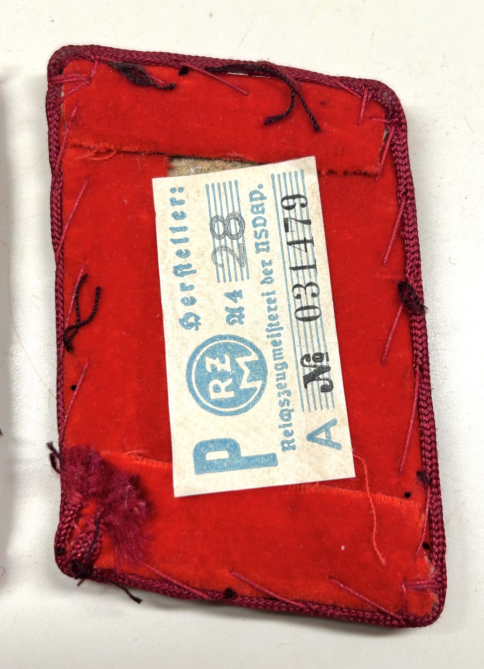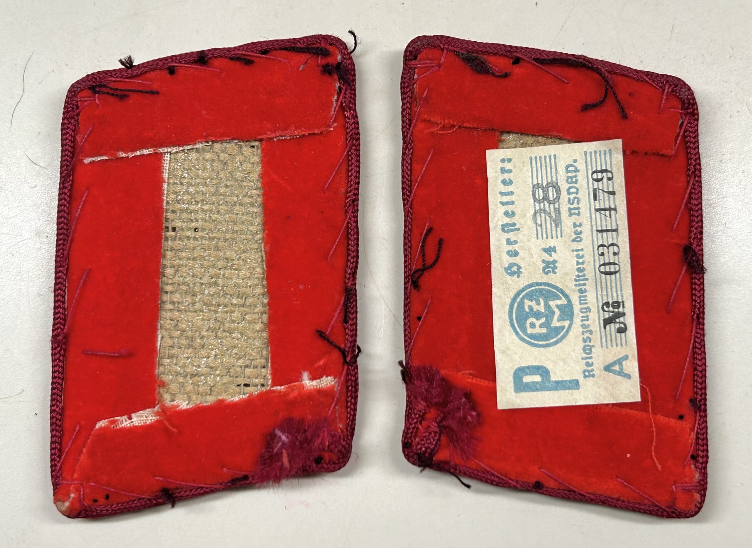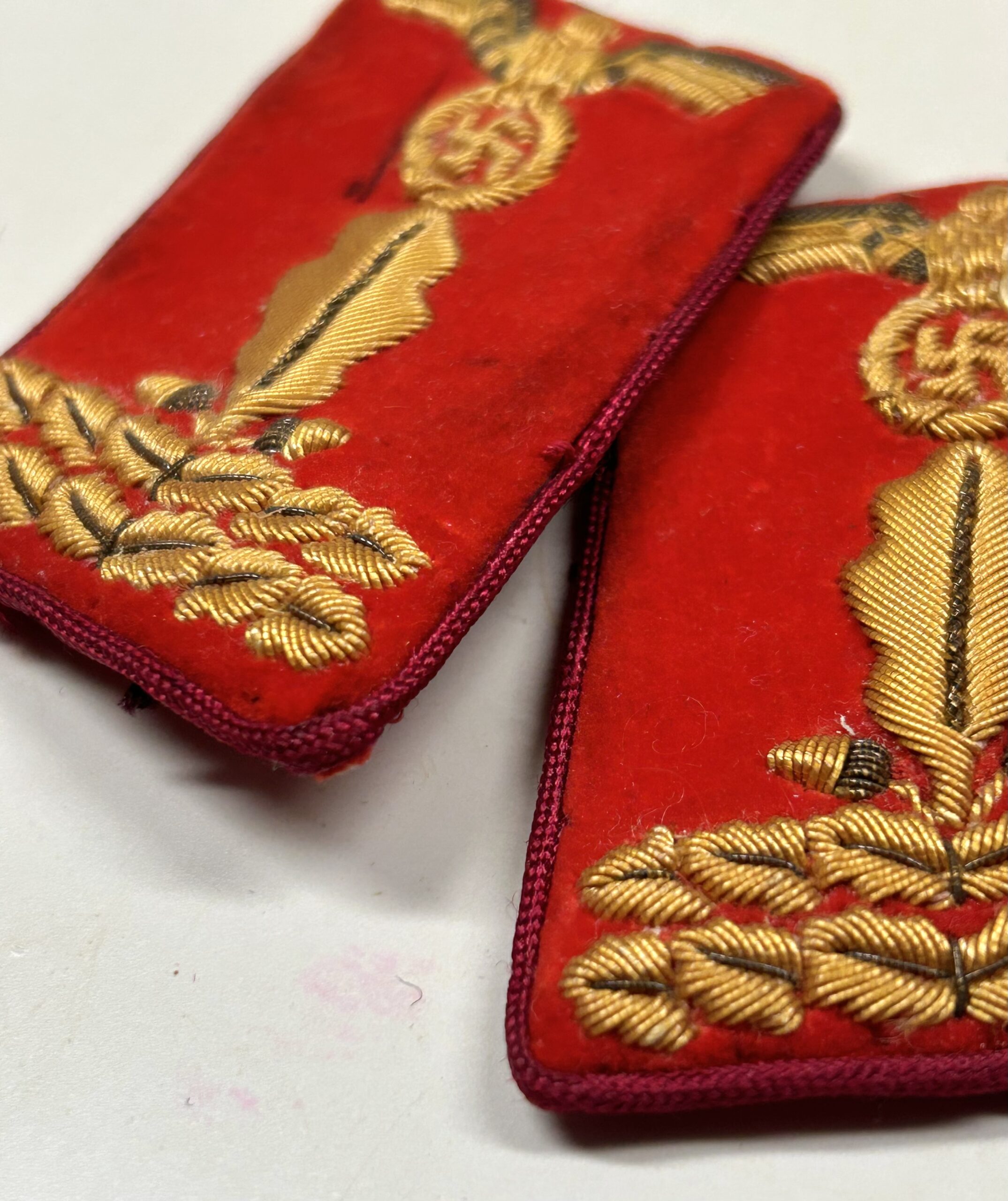 Incredible, and very sought after matched set of uniform removed collar tabs for a high ranking member of the NSDAP at the Gau Level (Gauleitung) with the rank of Gauleitung Hauptabschnittsleiter. These tabs are construction on a red velvet base, with dark red rayon piping. The tabs features a hand embroidered gold celleon national eagle clutching a wreathed, static swastika in its talons, as worn between 1939-45. Beneath the eagle is a single oak leaf, with an acorn to either side of its base, and double horizontal sprays of oak leaves. This combination indicates an “Haupt-AbschnittsLeiter” rank. Original RZM tag is still attatched, and there are clear sings of being worn during the period. Rare & nice set!