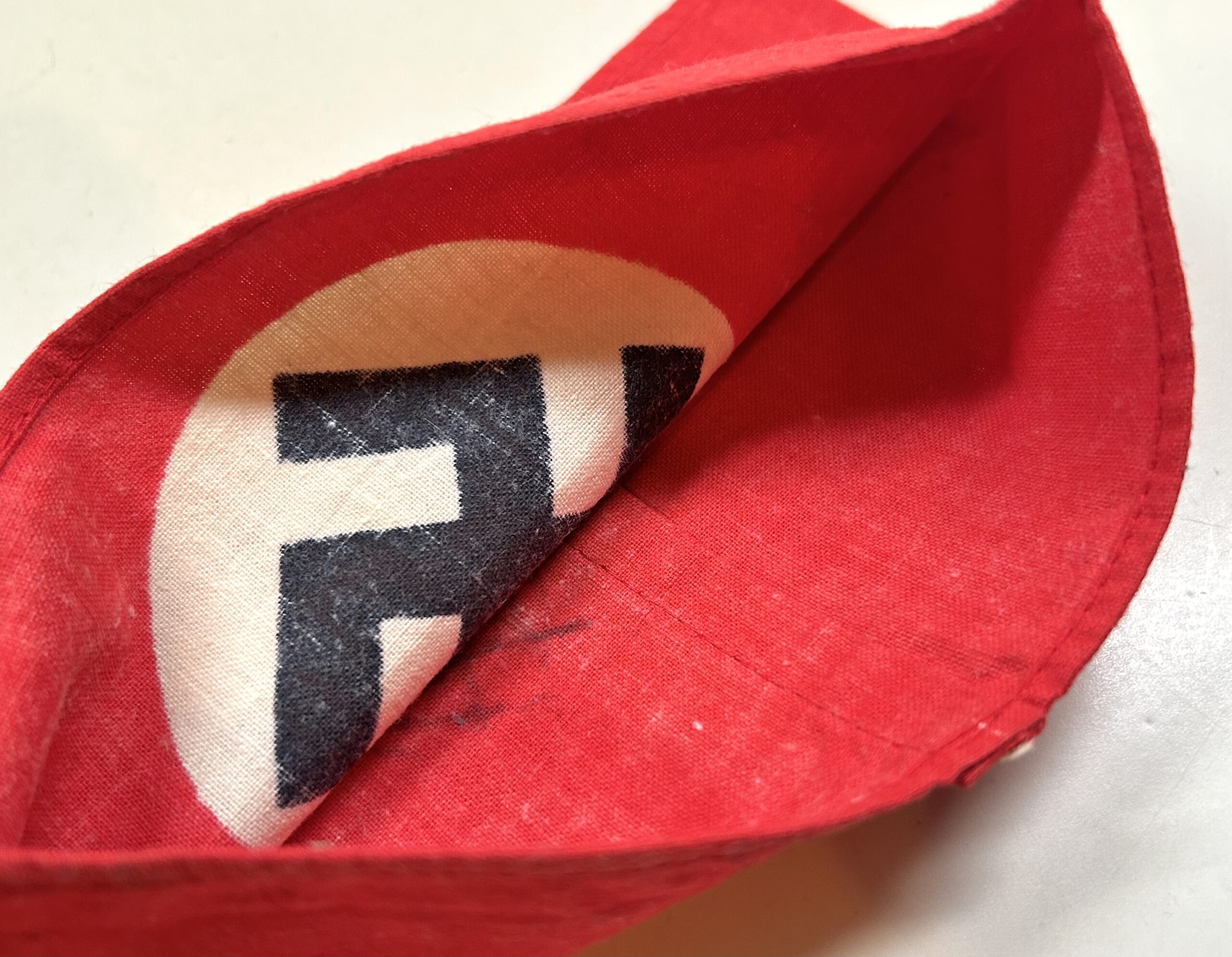 Great looking NSDAP Party armband with clear signs of being period worn. This example is the later period printed type, clear signs of being issued and worn during the time. Nice looking piece that is rather hard to come across in a true issued condition.