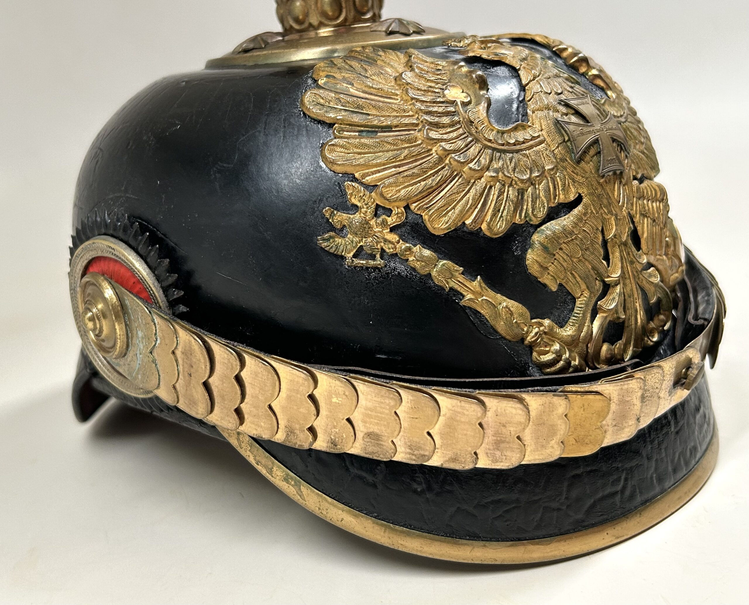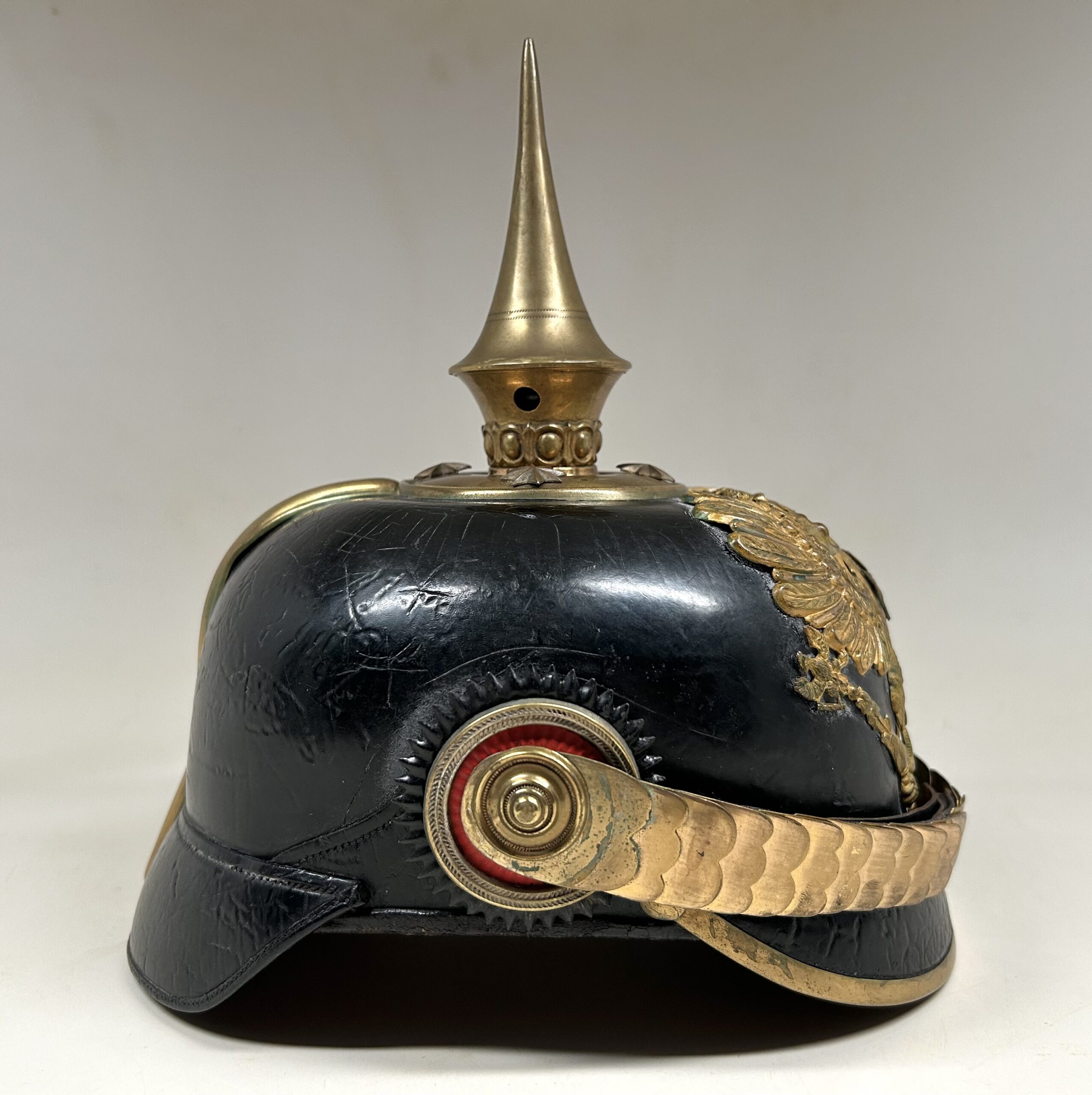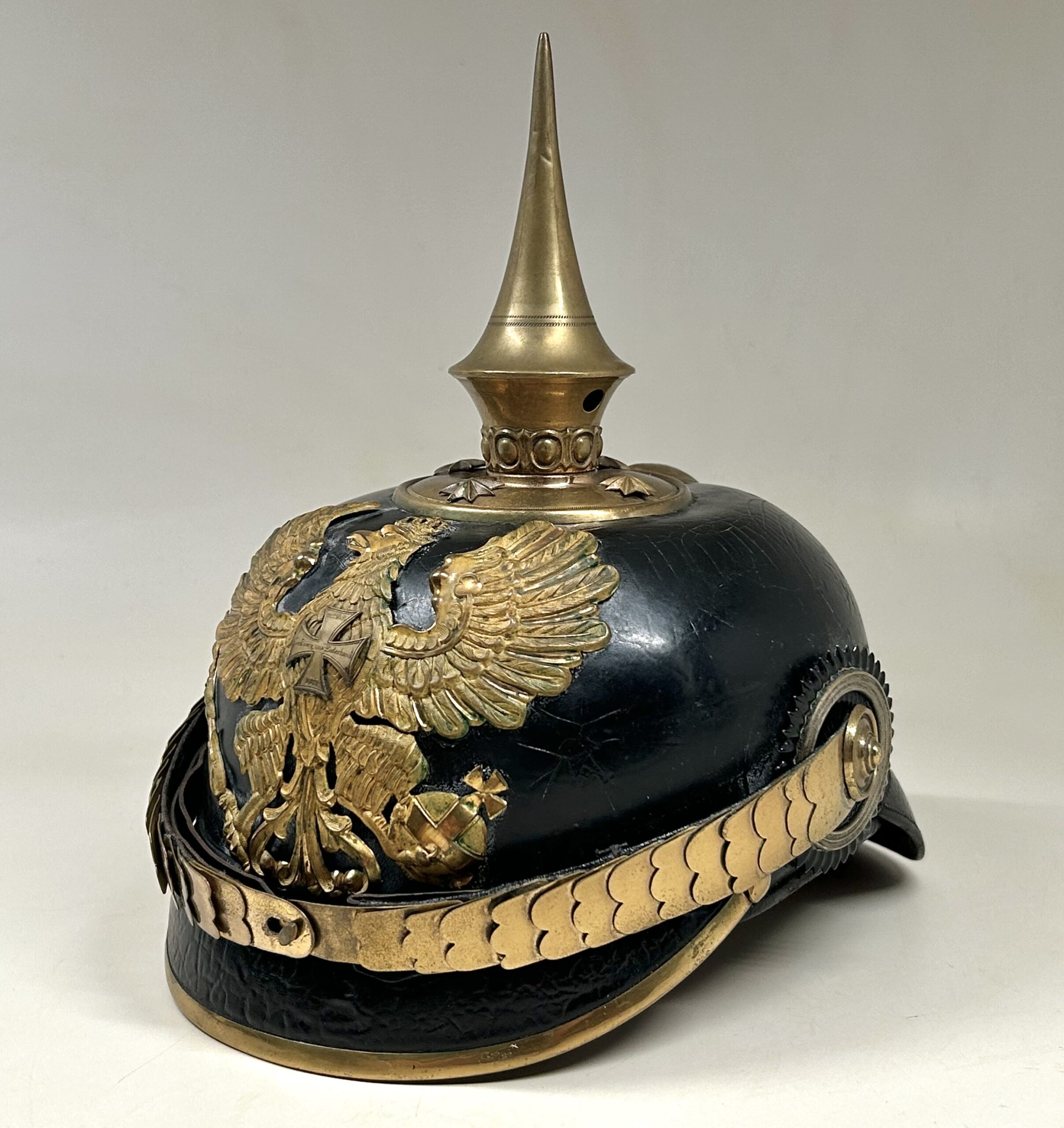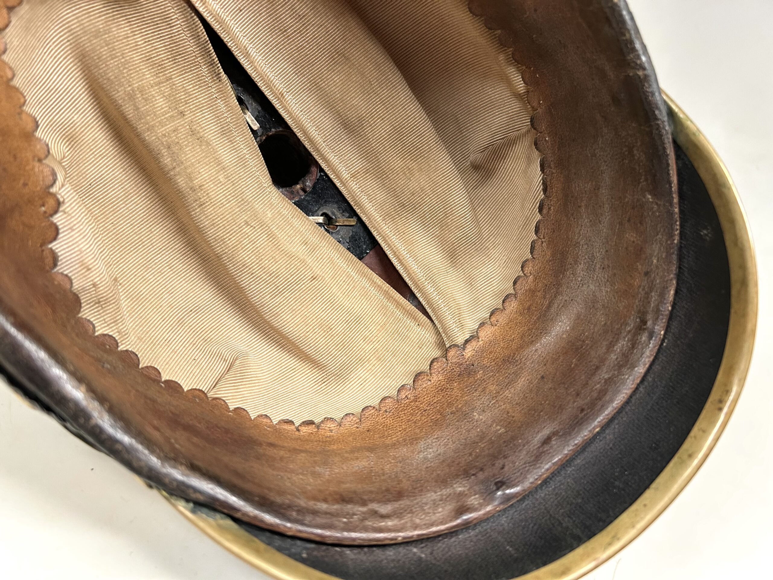 This is a Prussian reserve infantry officer’s pickelhaube, dating back to the pre-war period of 1900-1910. It boasts a high-quality leather body with some minor surface imperfections, most notably on the left side but with no loss of leather. The helmet’s furniture, including the wappen, chinscales, base, officer stars, spike, back strap, and front visor trim, are all made of brass. The correct Reich and state kokarden are also in place. The interior of the helmet features a dark brown leather sweatband showing normal wear, as well as a gold smooth silk liner. The front plate shows the Prussian emblem with a small cross to the center indicating this man would’ve been in the reserve Infantry. Fantastic example that’s well over 100 years old!