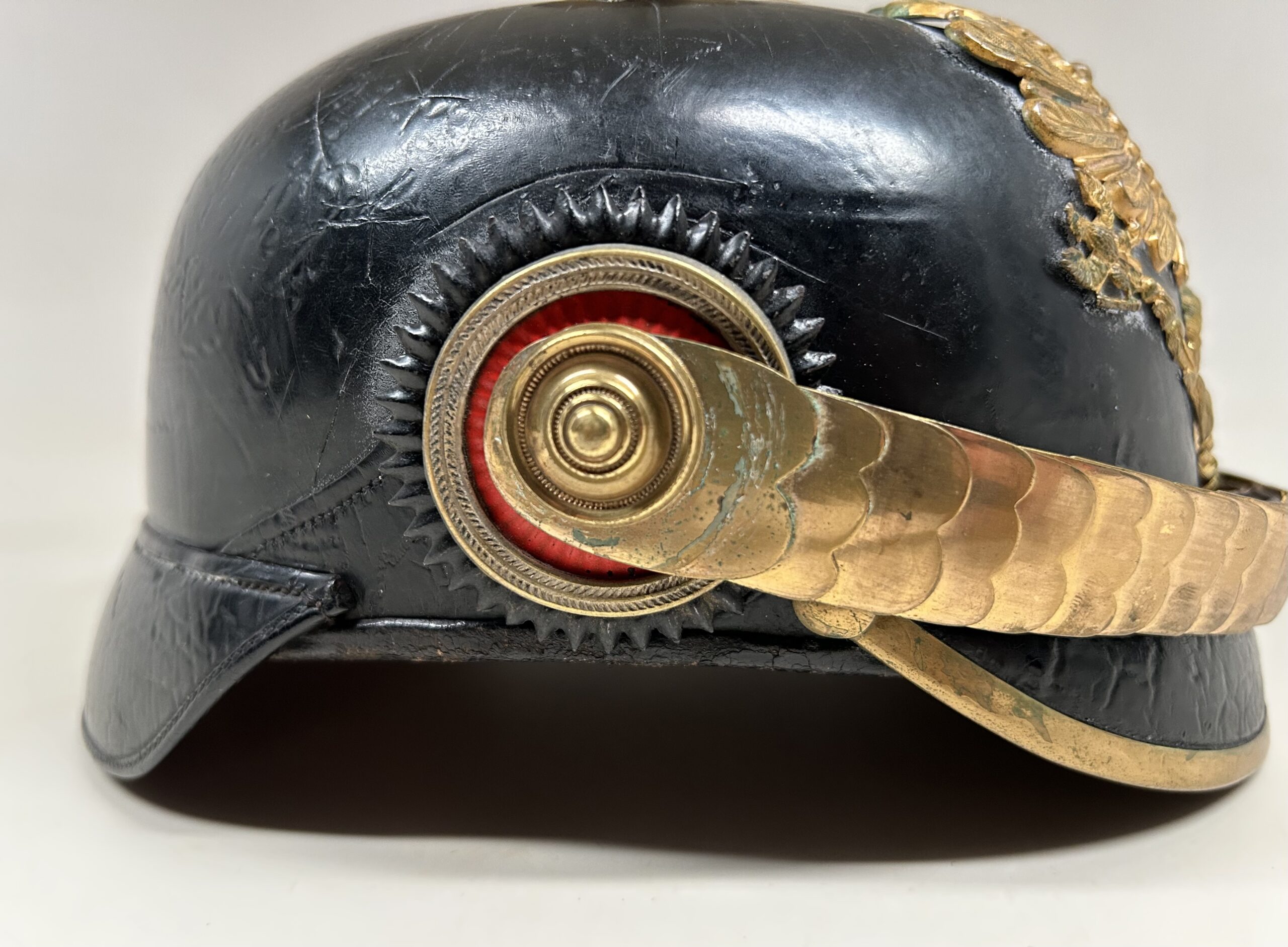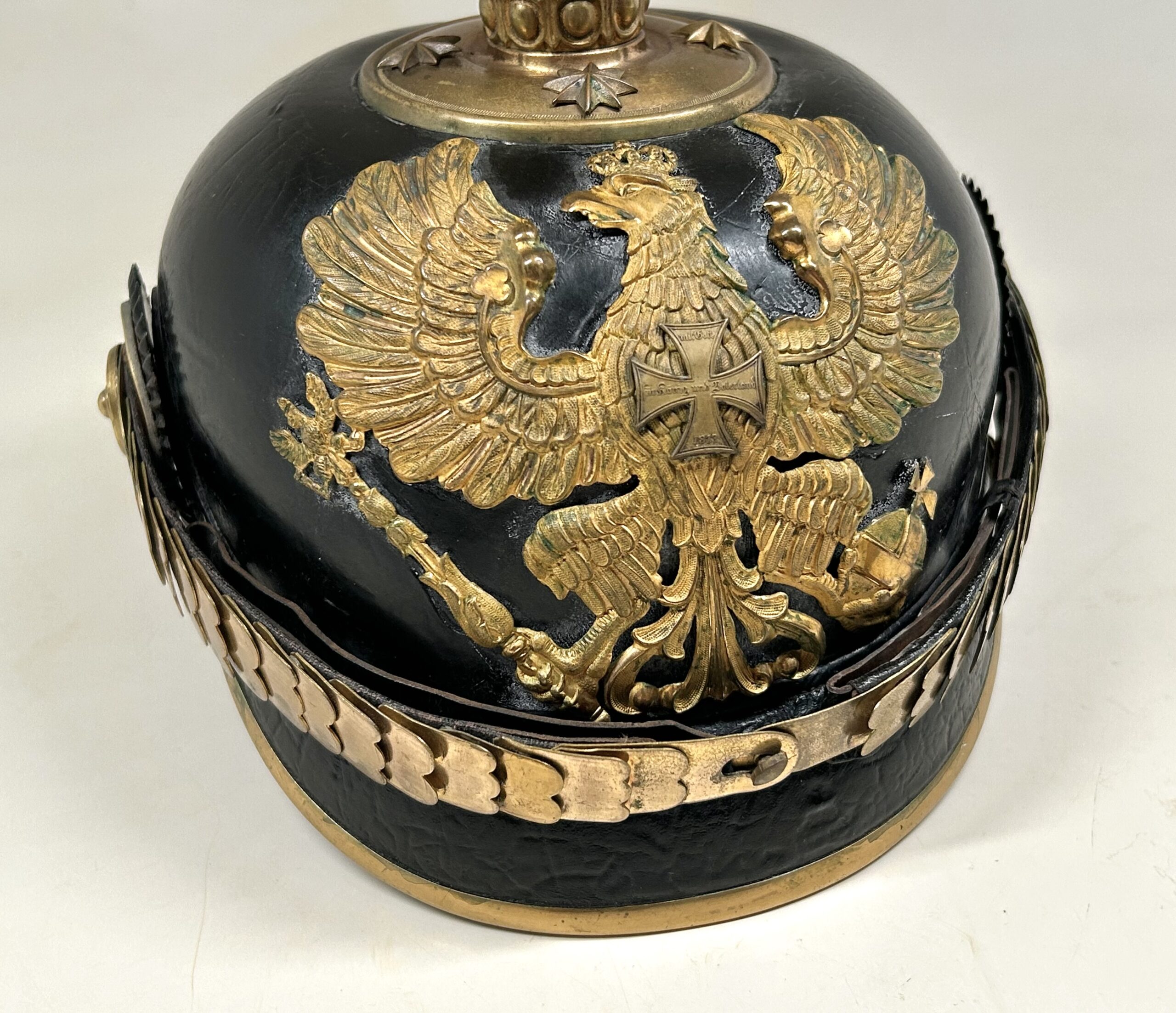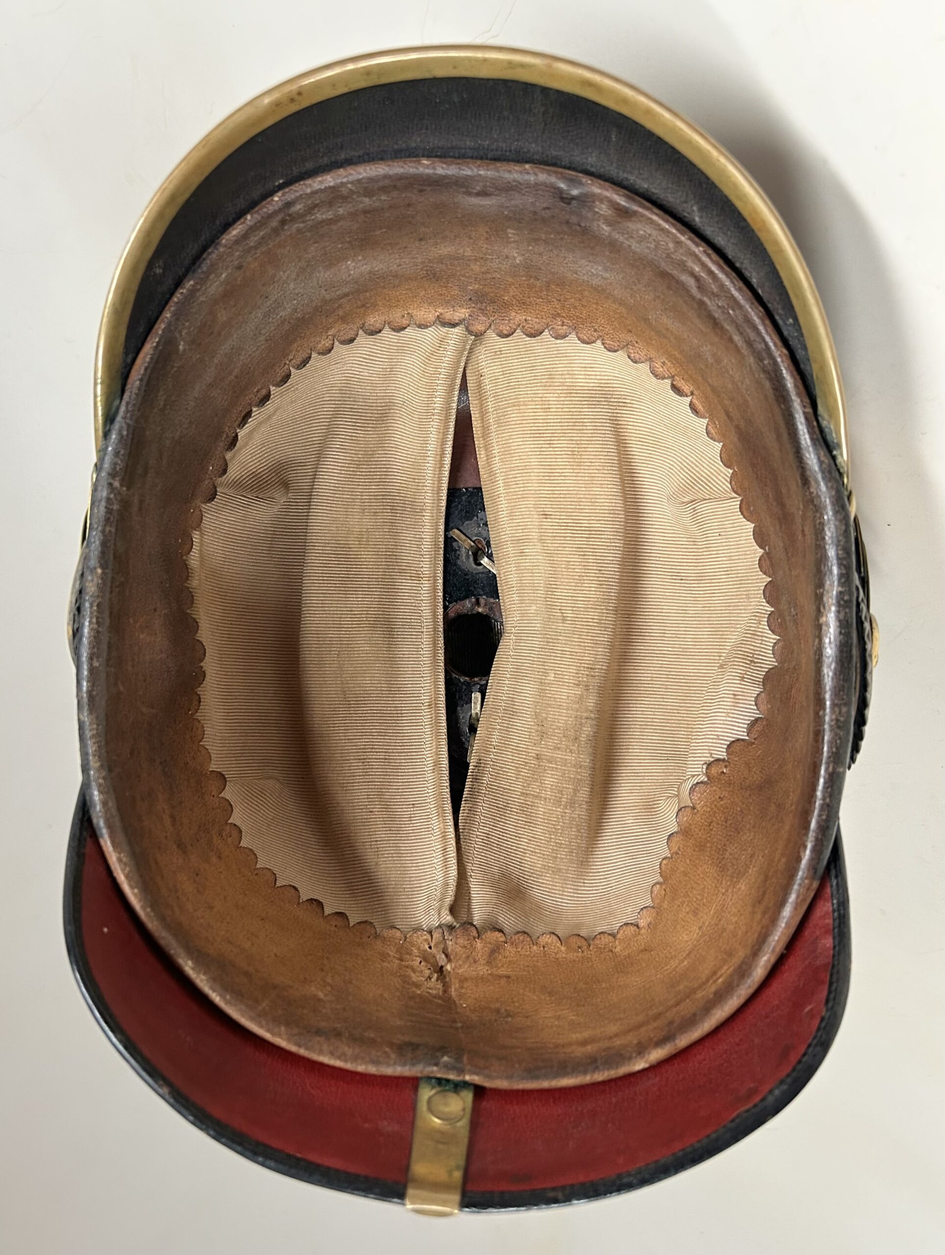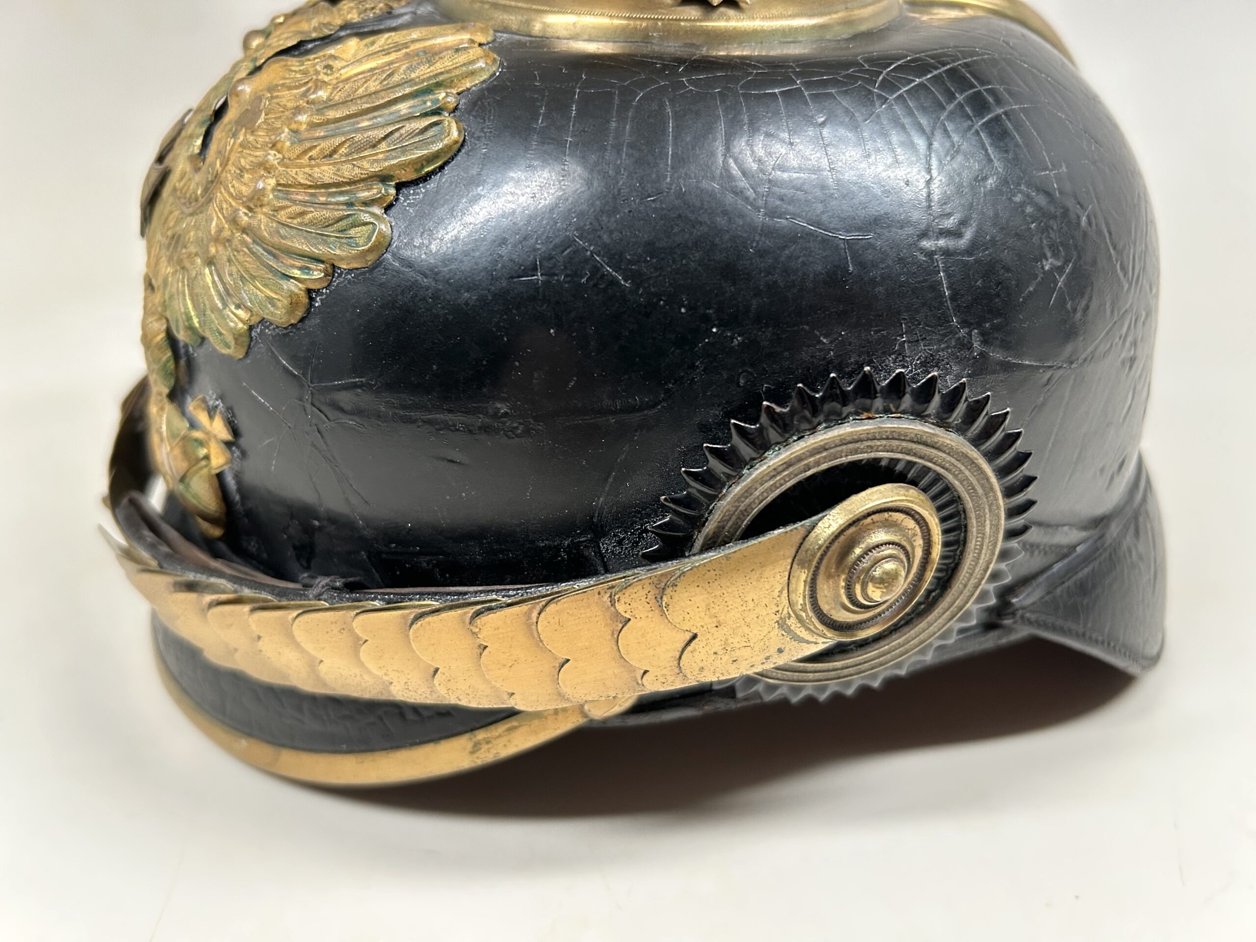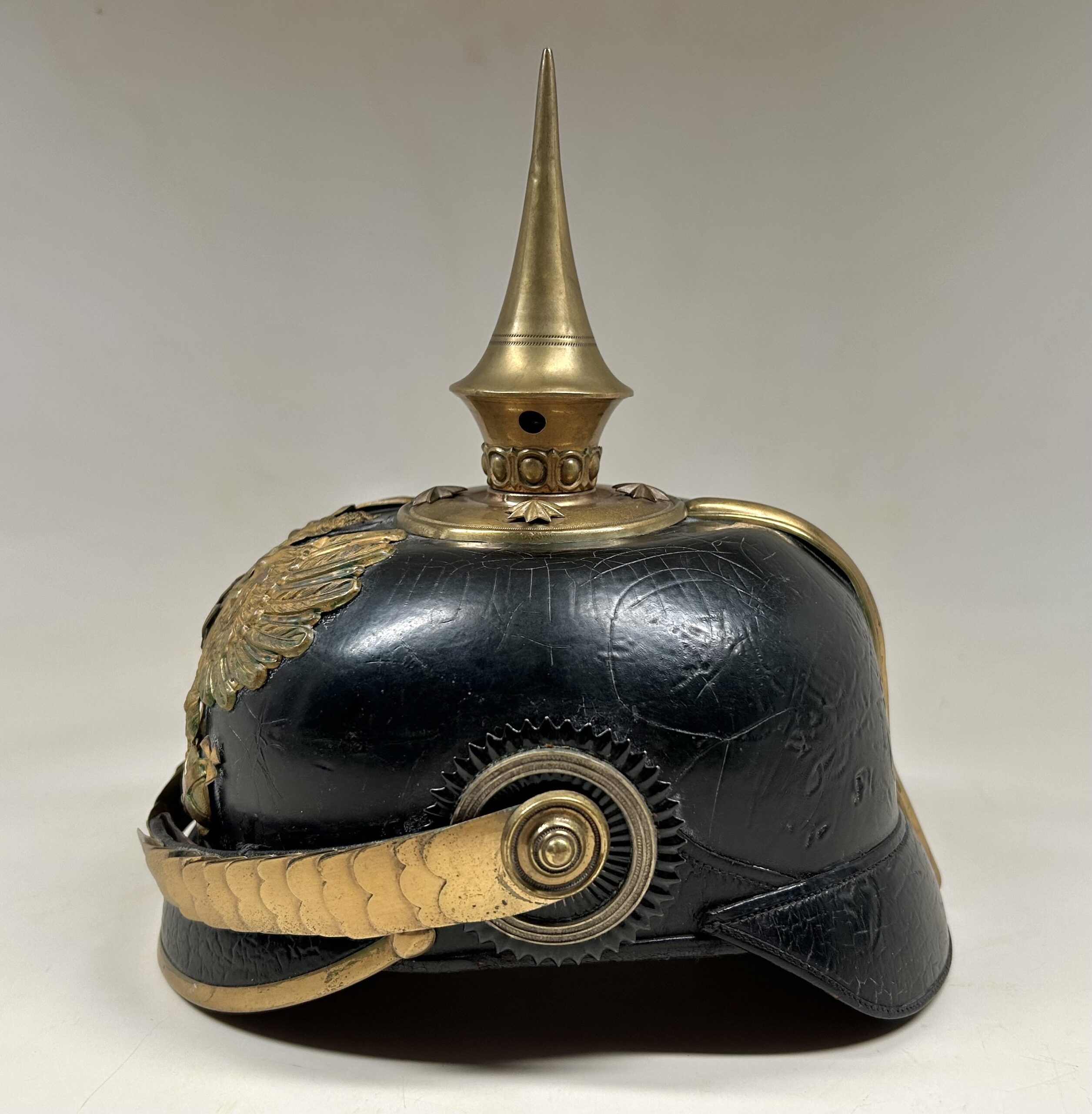 This is a Prussian reserve infantry officer’s pickelhaube, dating back to the pre-war period of 1900-1910. It boasts a high-quality leather body with some minor surface imperfections, most notably on the left side but with no loss of leather. The helmet’s furniture, including the wappen, chinscales, base, officer stars, spike, back strap, and front visor trim, are all made of brass. The correct Reich and state kokarden are also in place. The interior of the helmet features a dark brown leather sweatband showing normal wear, as well as a gold smooth silk liner. The front plate shows the Prussian emblem with a small cross to the center indicating this man would’ve been in the reserve Infantry. Fantastic example that’s well over 100 years old!
