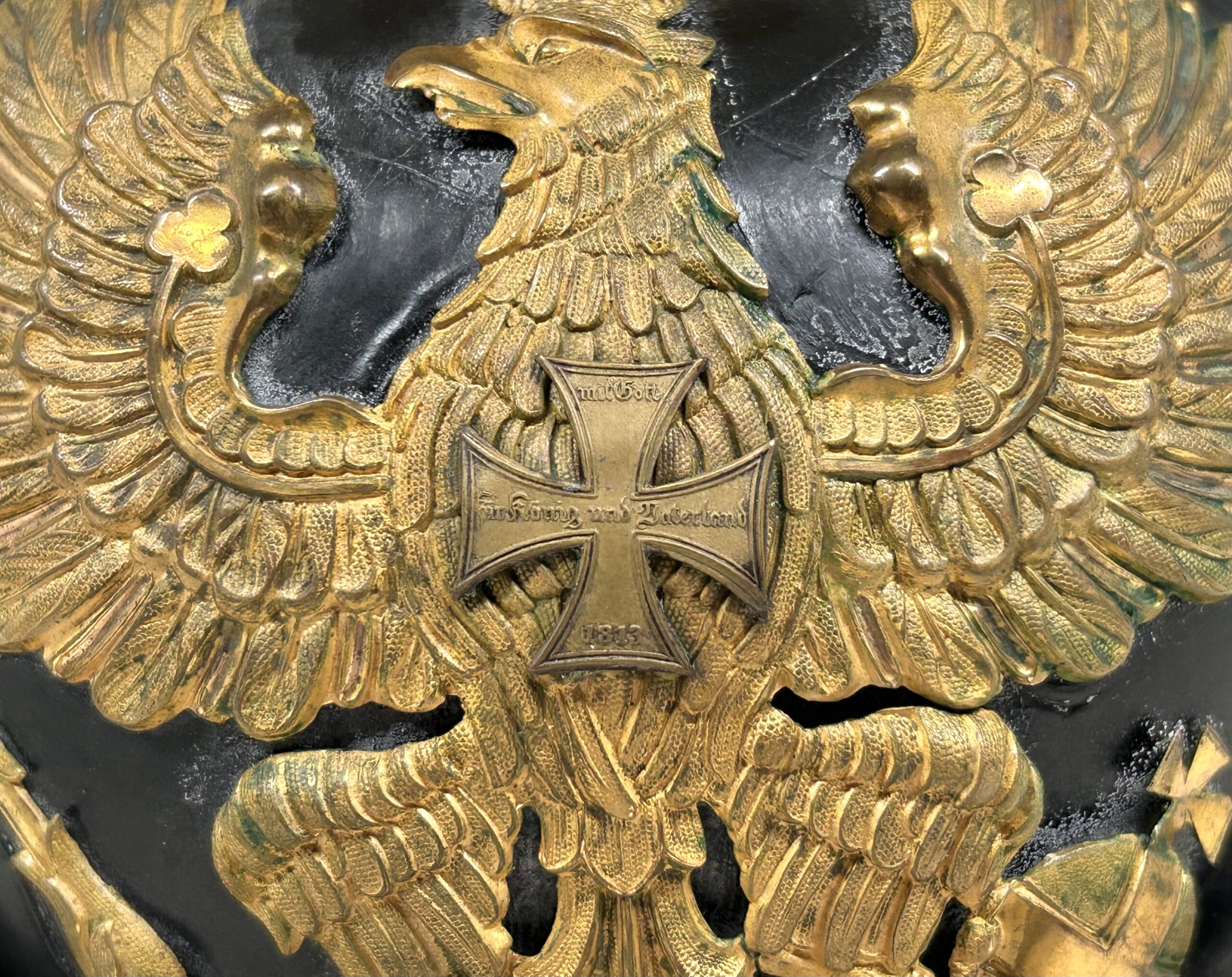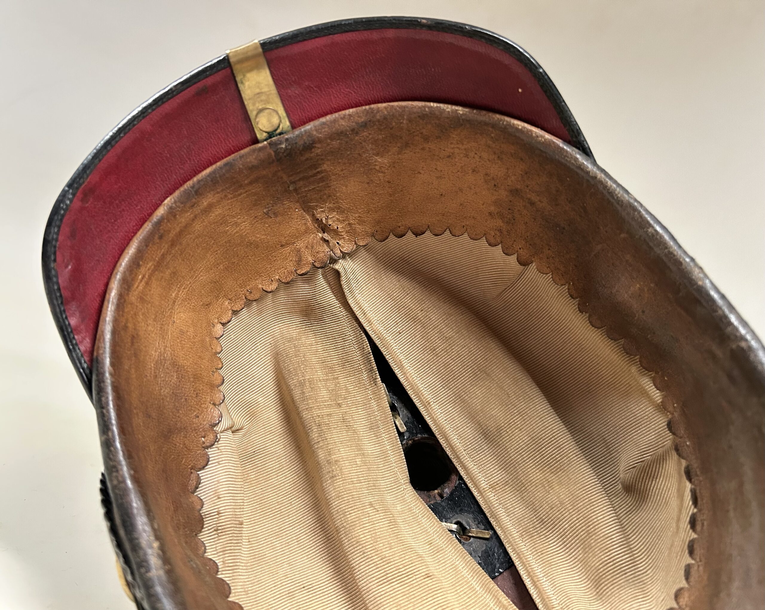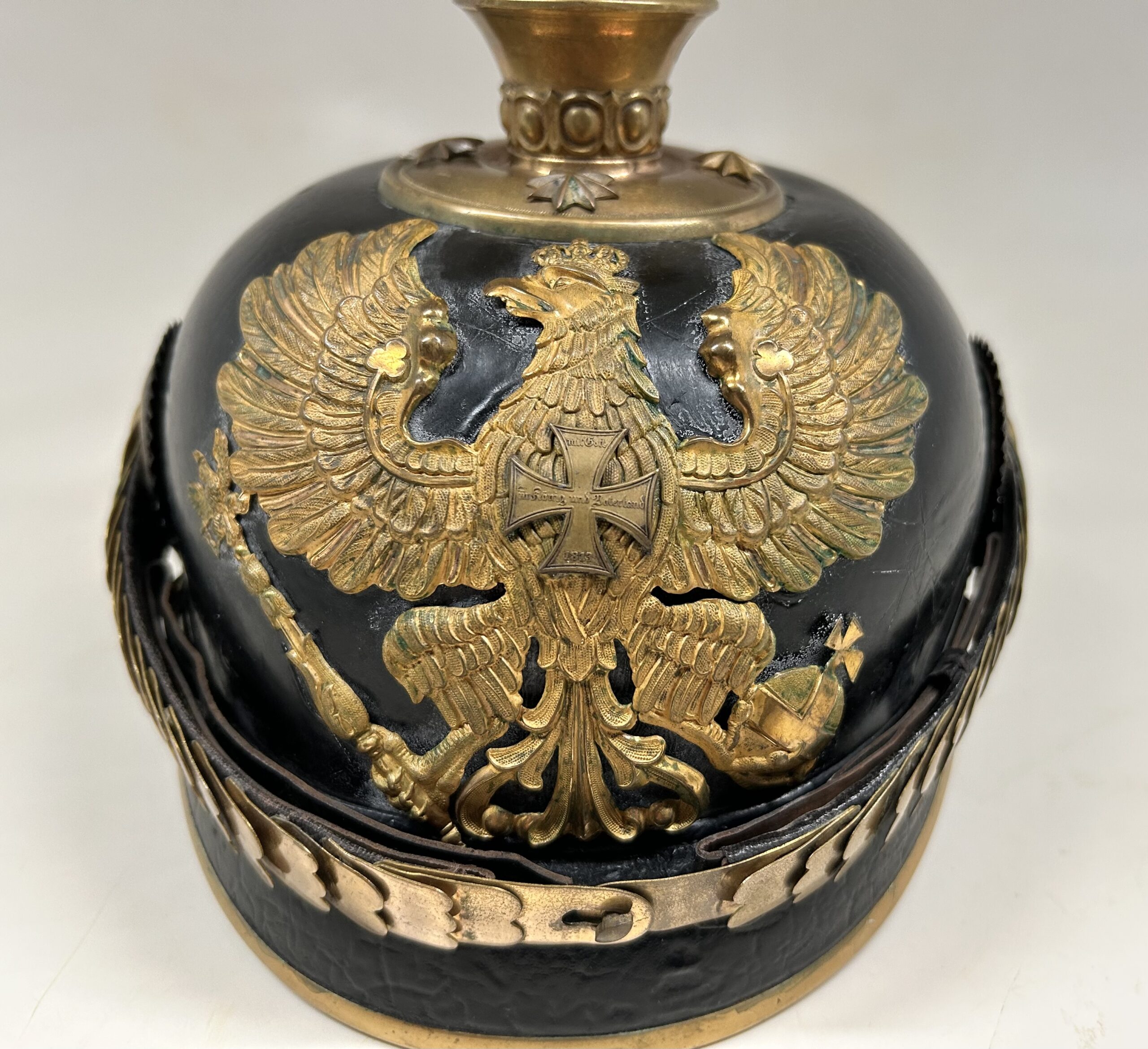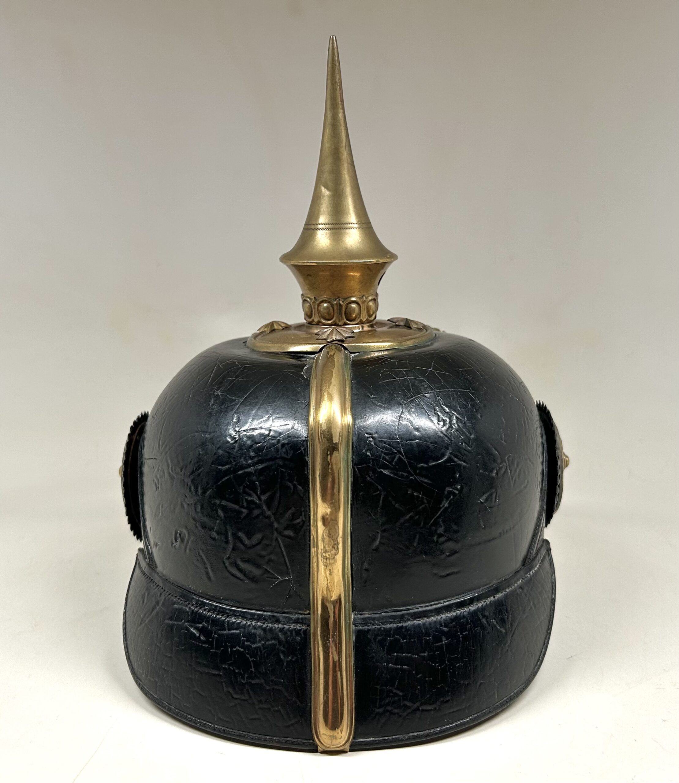 This is a Prussian reserve infantry officer’s pickelhaube, dating back to the pre-war period of 1900-1910. It boasts a high-quality leather body with some minor surface imperfections, most notably on the left side but with no loss of leather. The helmet’s furniture, including the wappen, chinscales, base, officer stars, spike, back strap, and front visor trim, are all made of brass. The correct Reich and state kokarden are also in place. The interior of the helmet features a dark brown leather sweatband showing normal wear, as well as a gold smooth silk liner. The front plate shows the Prussian emblem with a small cross to the center indicating this man would’ve been in the reserve Infantry. Fantastic example that’s well over 100 years old!
