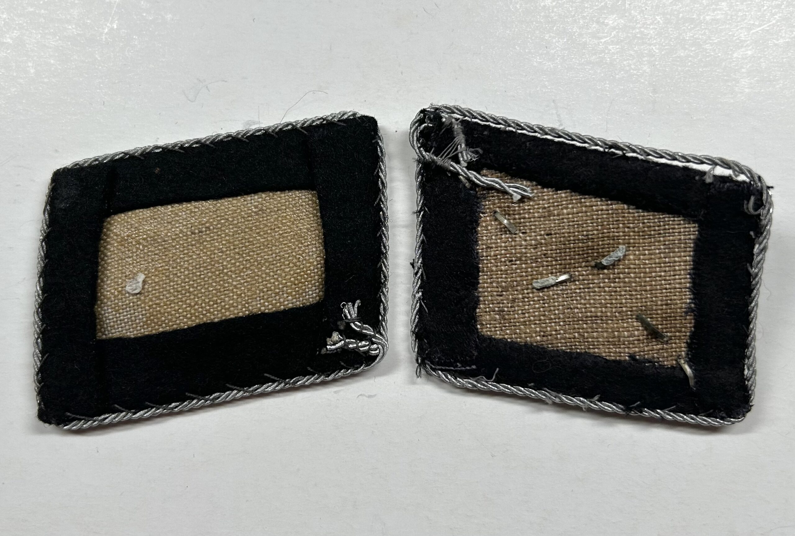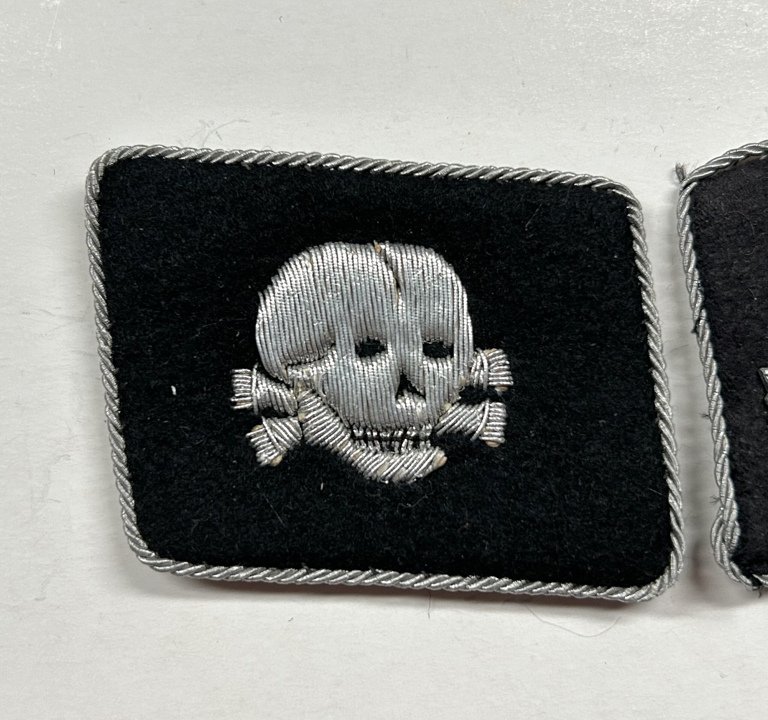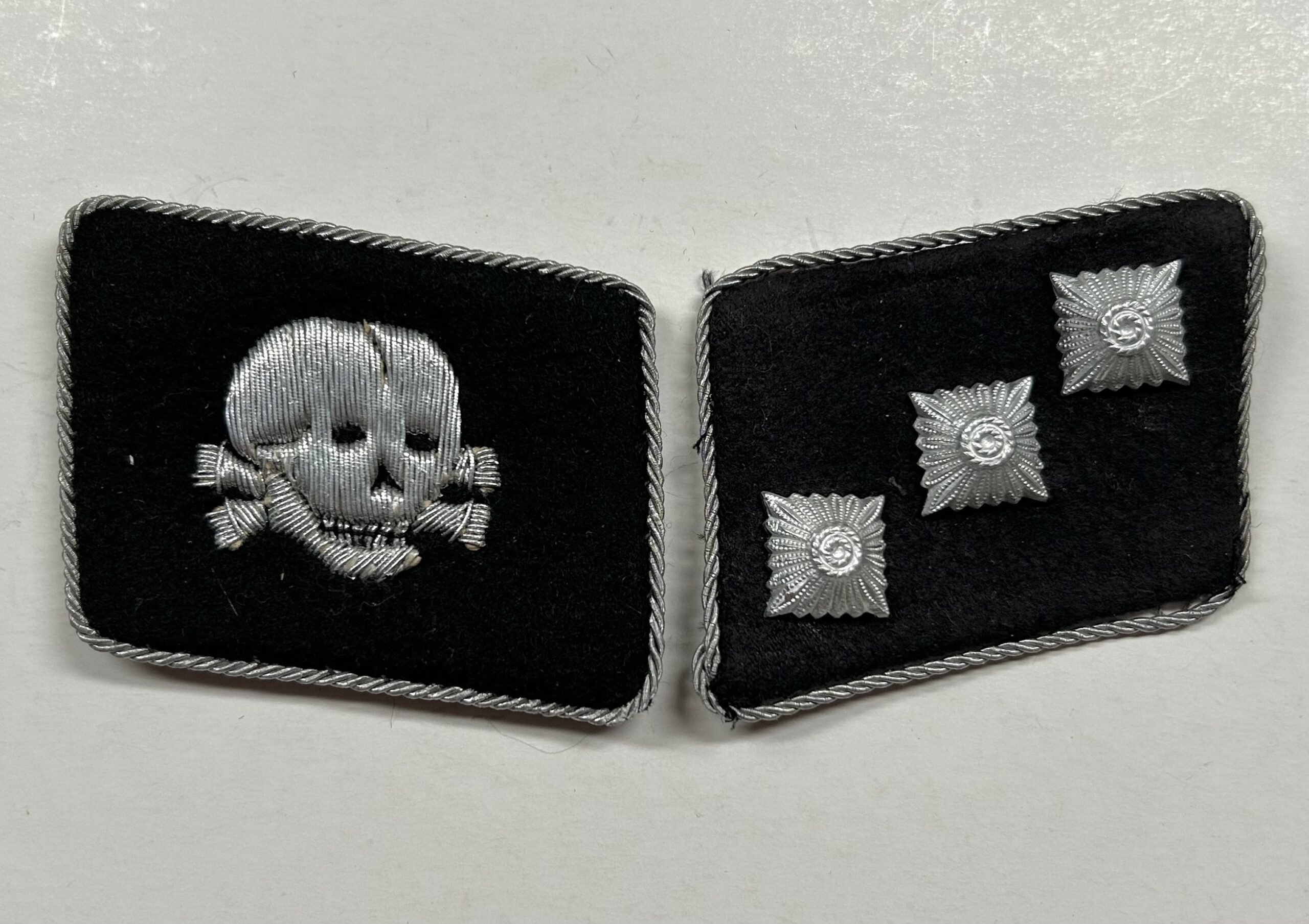 Very rare, uniform removed collar tab set for an Officer with the rank of SS-Untersturmfuhrer. Clear signs of being worn during the period, the bullion Totenkopf skull is the rare left facing example indicating pre 1940 construction. Textbook, very sought after, these matched sets do not pop up often!