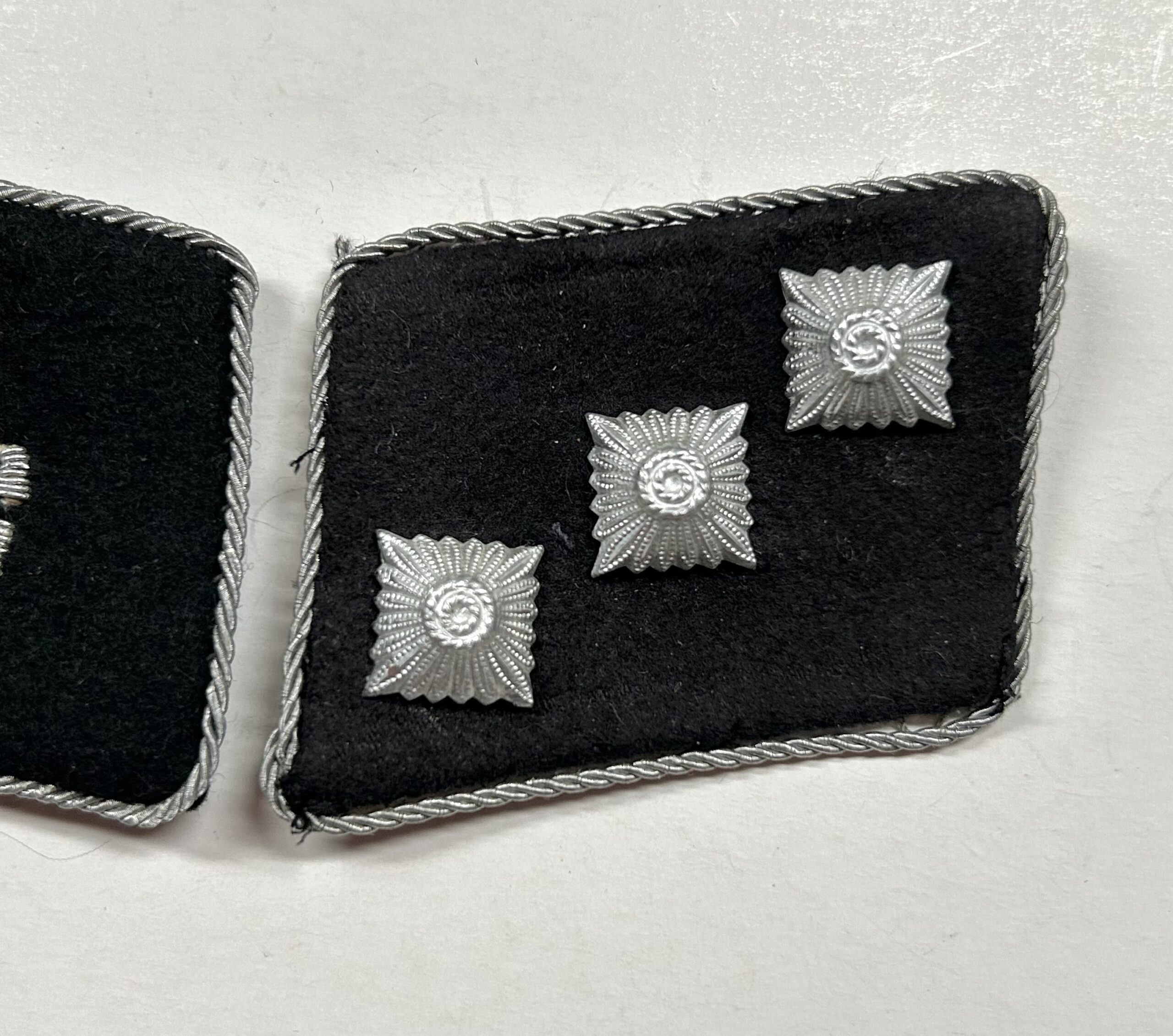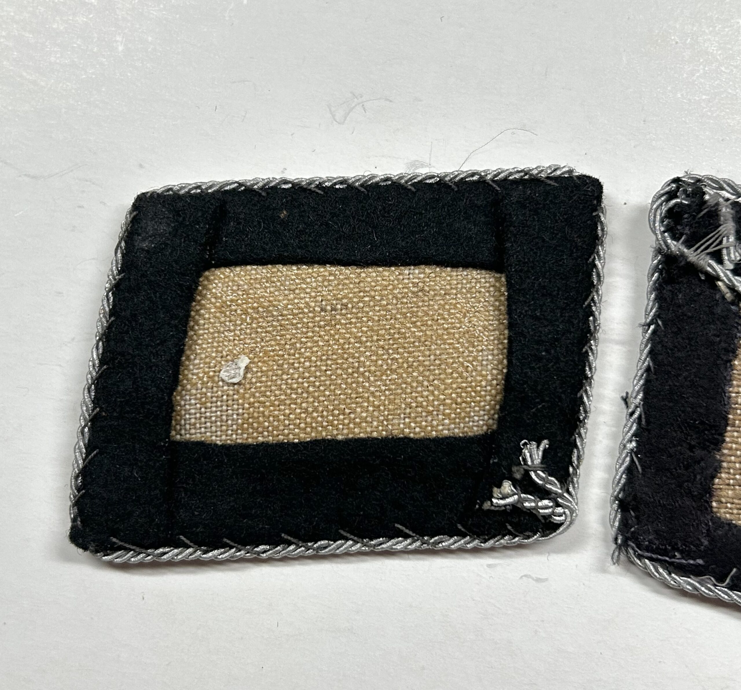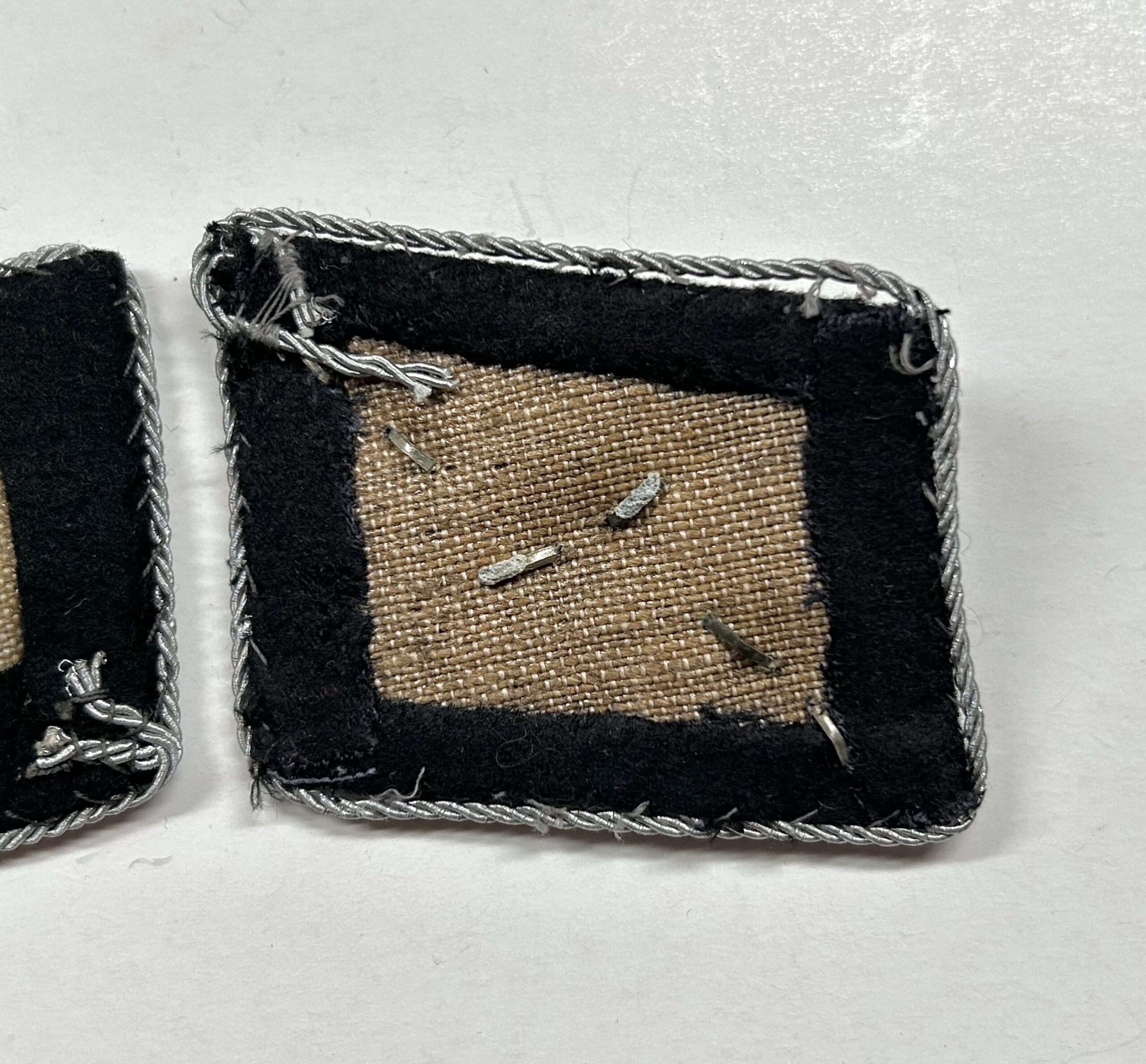 Very rare, uniform removed collar tab set for an Officer with the rank of SS-Untersturmfuhrer. Clear signs of being worn during the period, the bullion Totenkopf skull is the rare left facing example indicating pre 1940 construction. Textbook, very sought after, these matched sets do not pop up often!