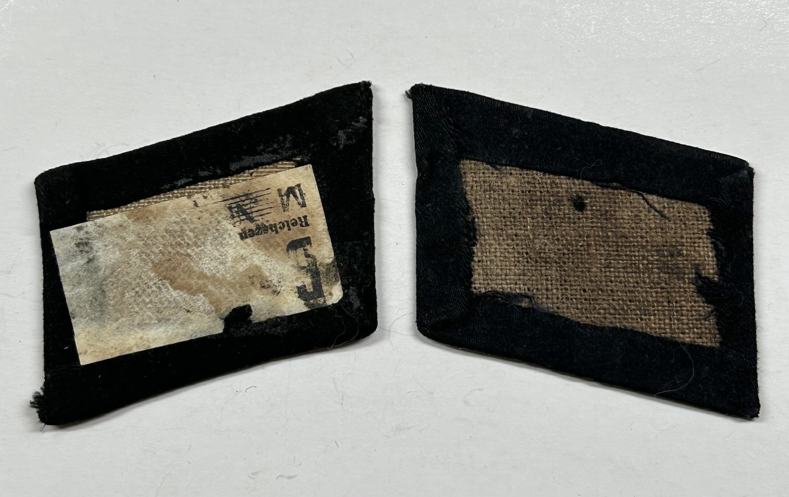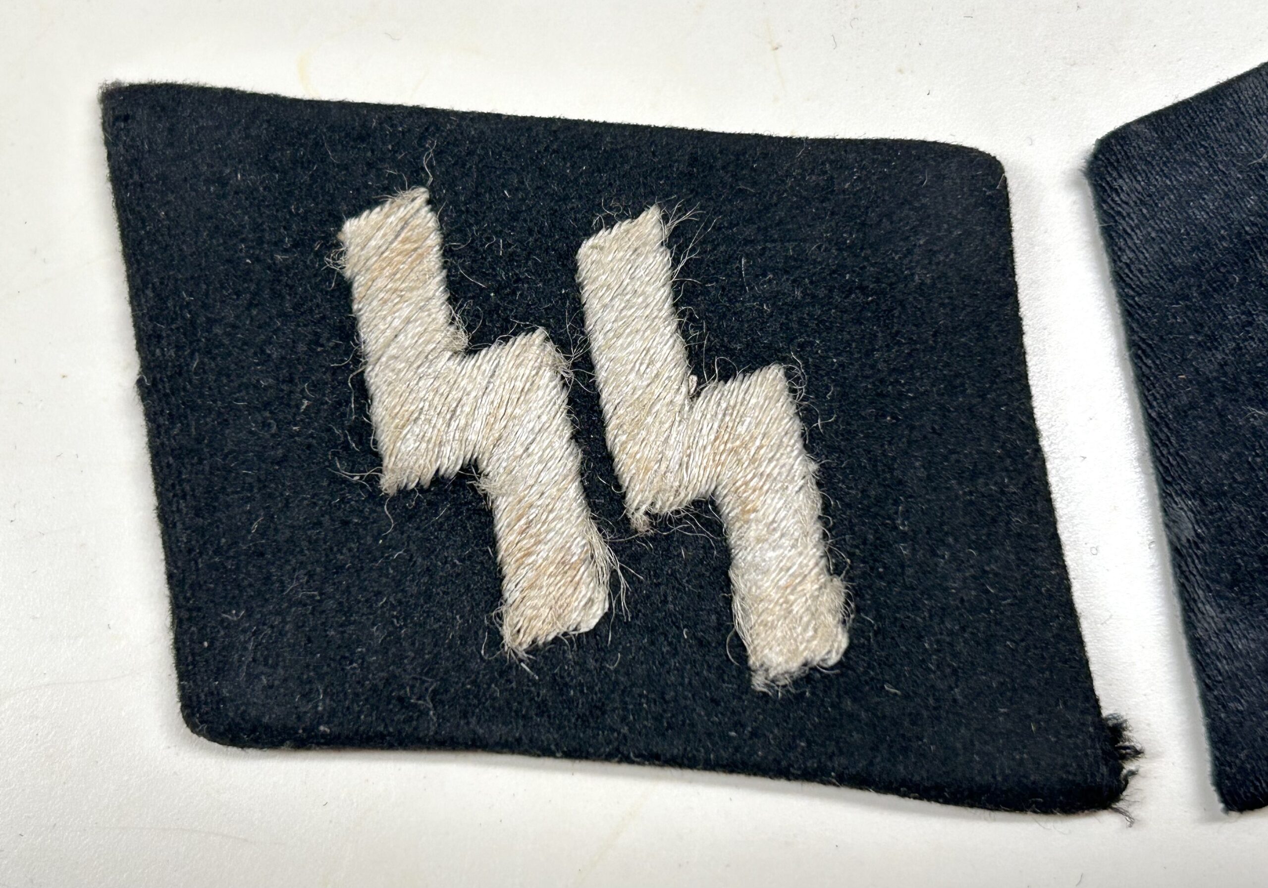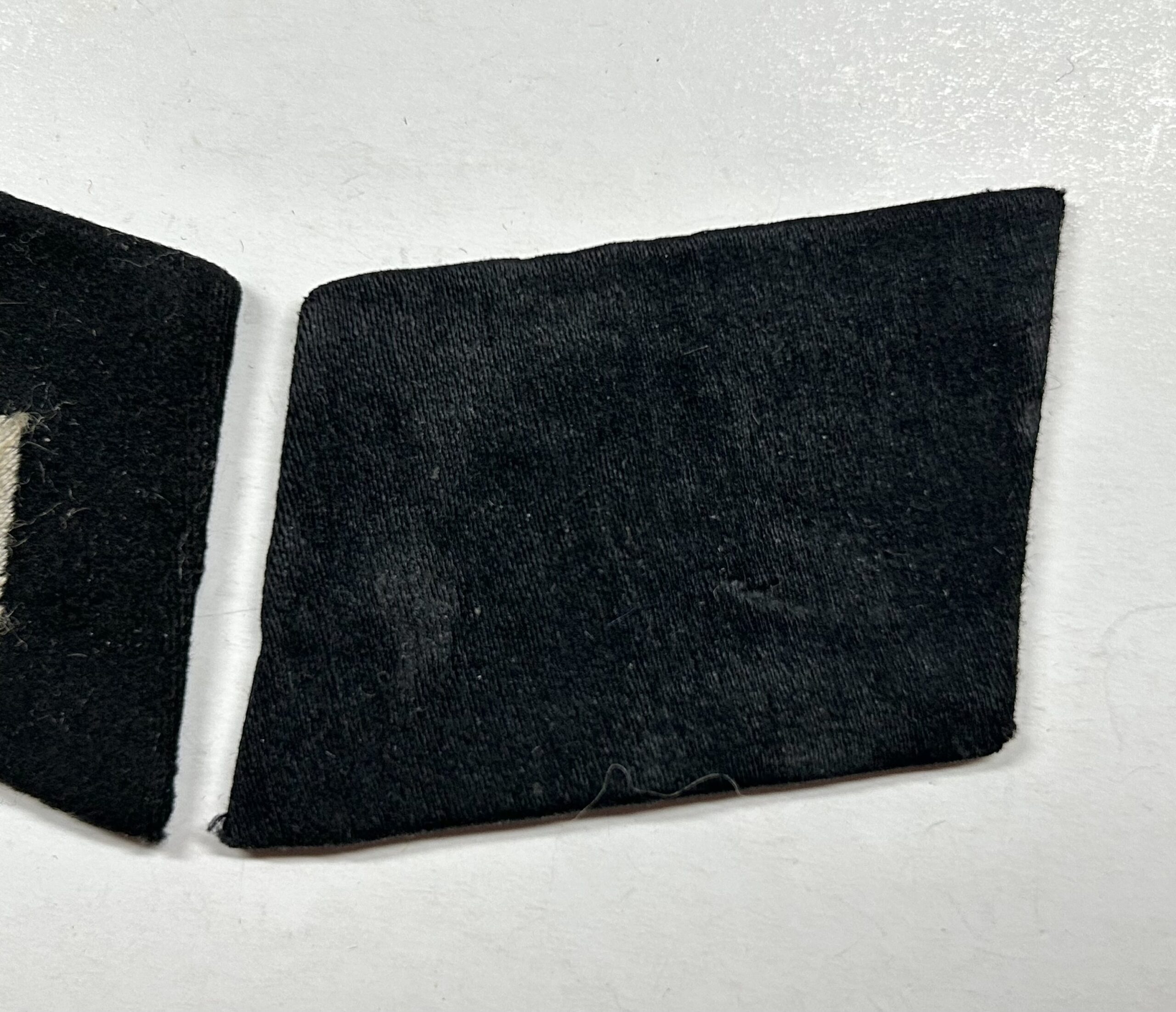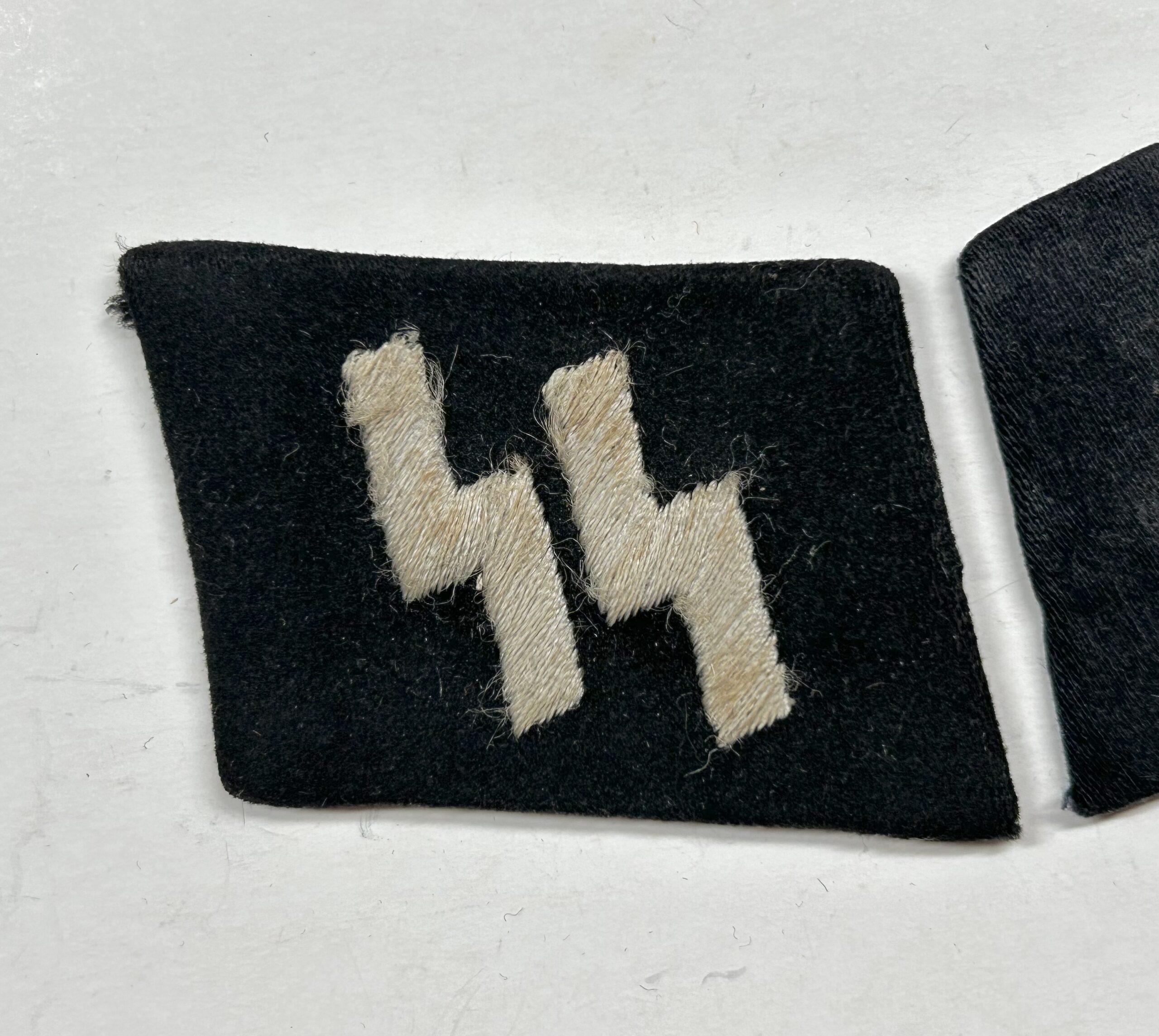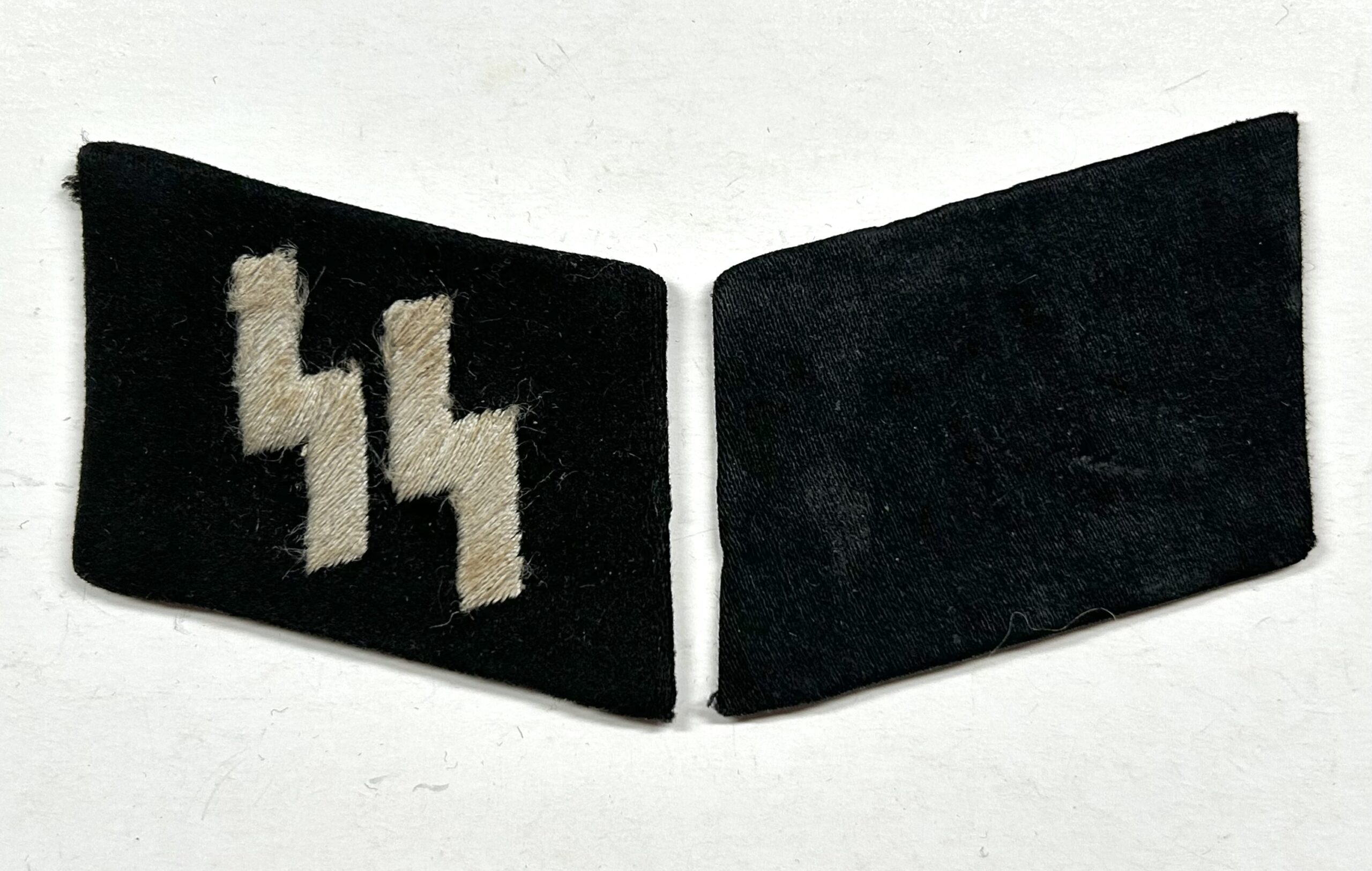 In regards to SS rune tabs, the type 1 RZM enlisted tab is one of the hardest to find. These would’ve been some of the earliest tabs worn by enlisted troops in the Waffen-SS. When found this rune and rank tab were stuck together in a large group of bring back insignia. They are both produced on high quality doeskin black wool, the rune tab has partial RZM paper tag on the reverse. The front of the rune shows white woven SS runes with no border edges, indicating a type 1 tab. This set matches perfectly and has been together since the war, you will not find a better, early enlisted collar tab set on the open market. Incredible collar tab set here!