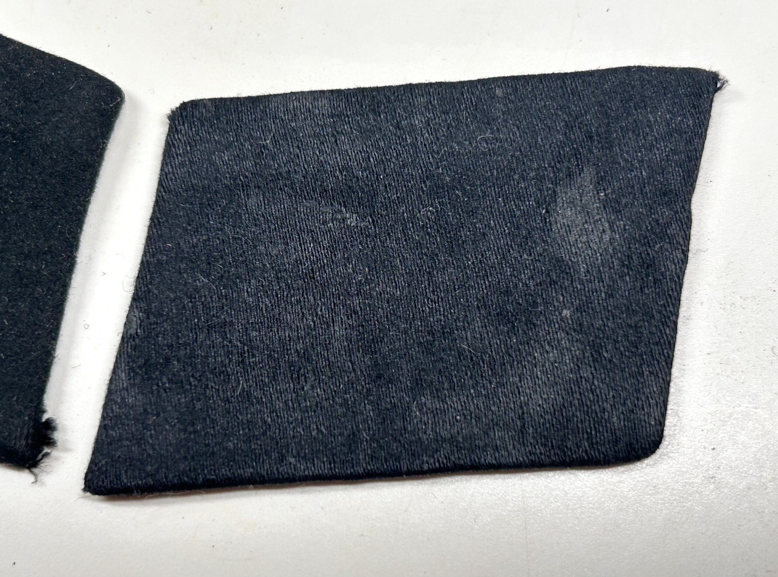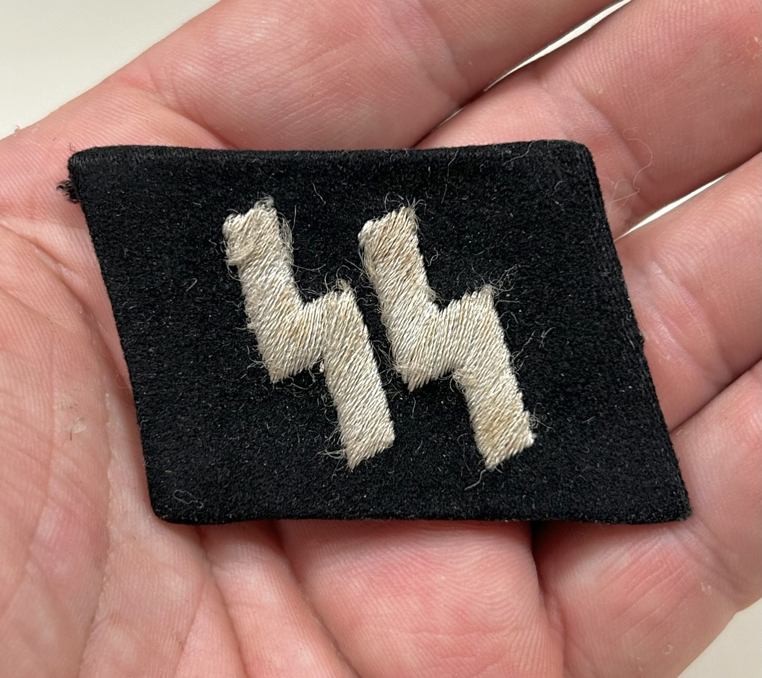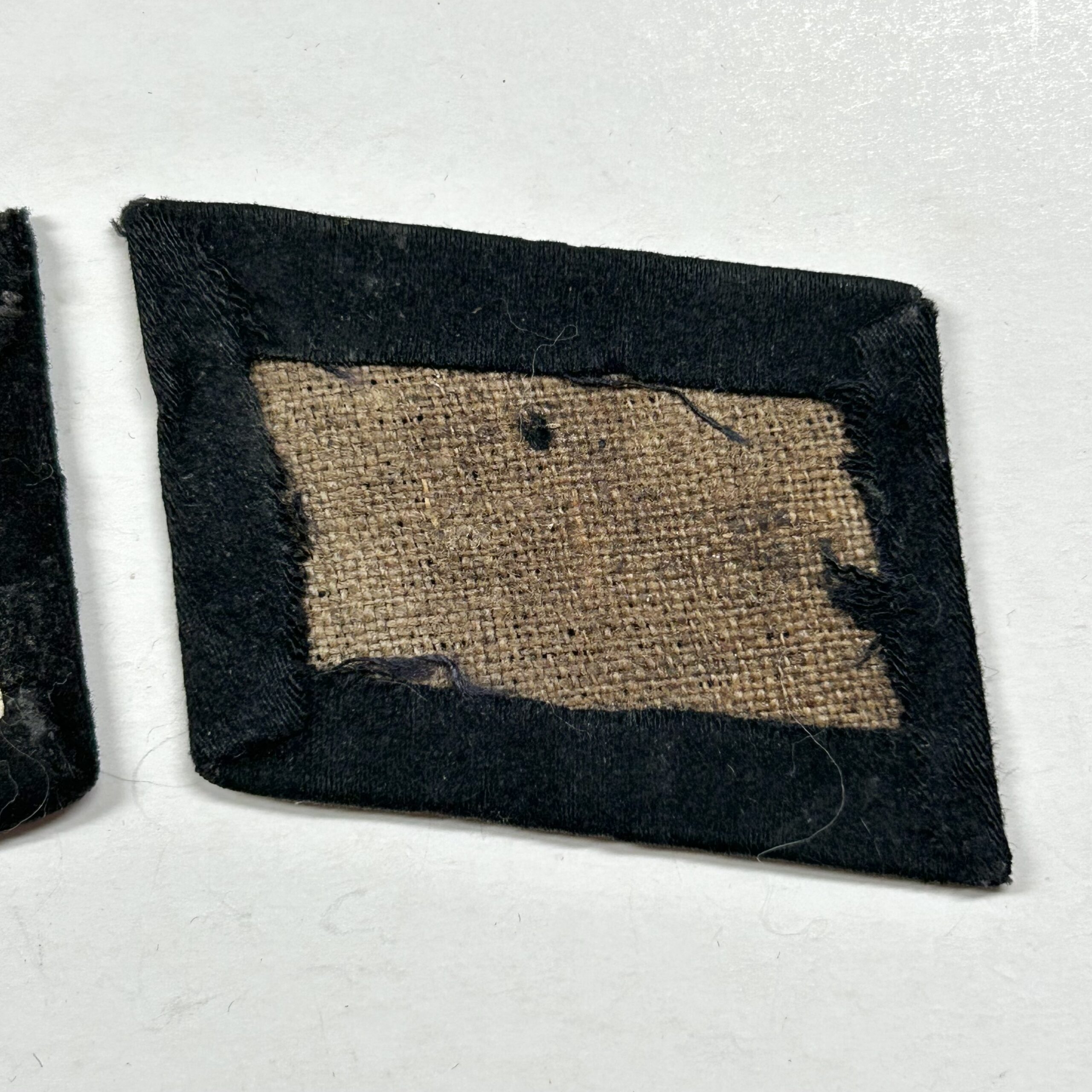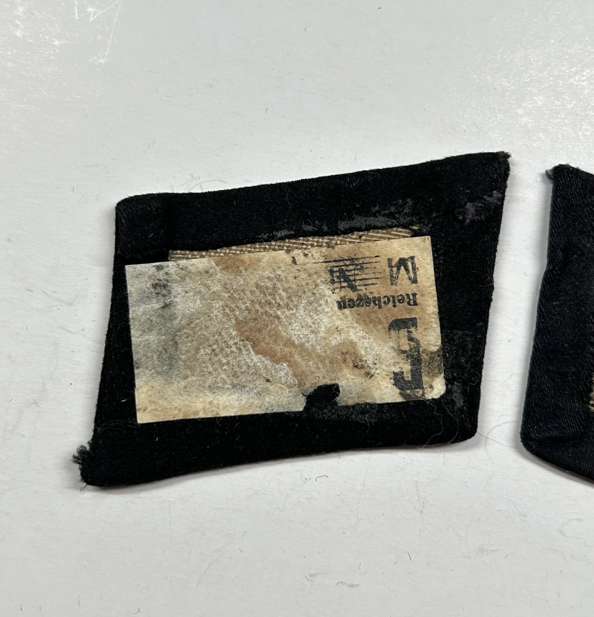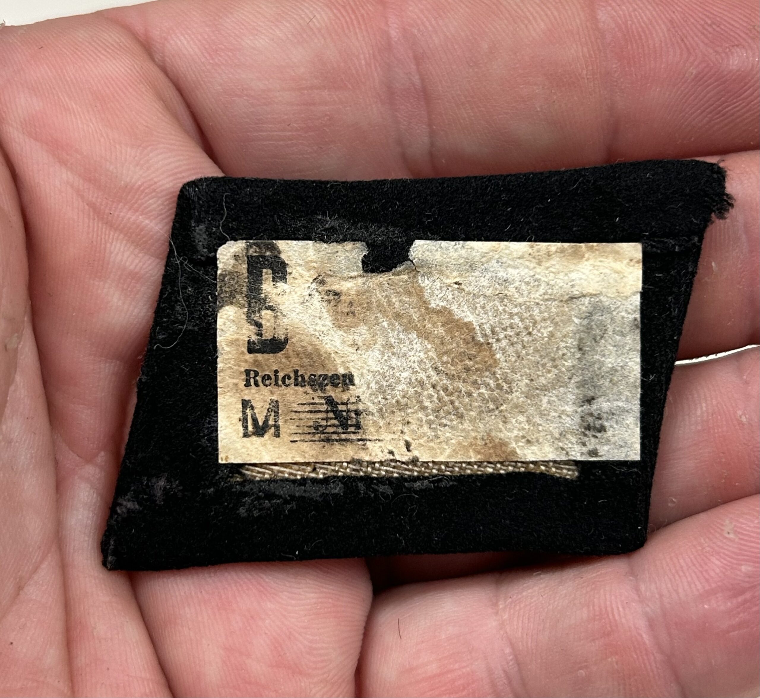 In regards to SS rune tabs, the type 1 RZM enlisted tab is one of the hardest to find. These would’ve been some of the earliest tabs worn by enlisted troops in the Waffen-SS. When found this rune and rank tab were stuck together in a large group of bring back insignia. They are both produced on high quality doeskin black wool, the rune tab has partial RZM paper tag on the reverse. The front of the rune shows white woven SS runes with no border edges, indicating a type 1 tab. This set matches perfectly and has been together since the war, you will not find a better, early enlisted collar tab set on the open market. Incredible collar tab set here!