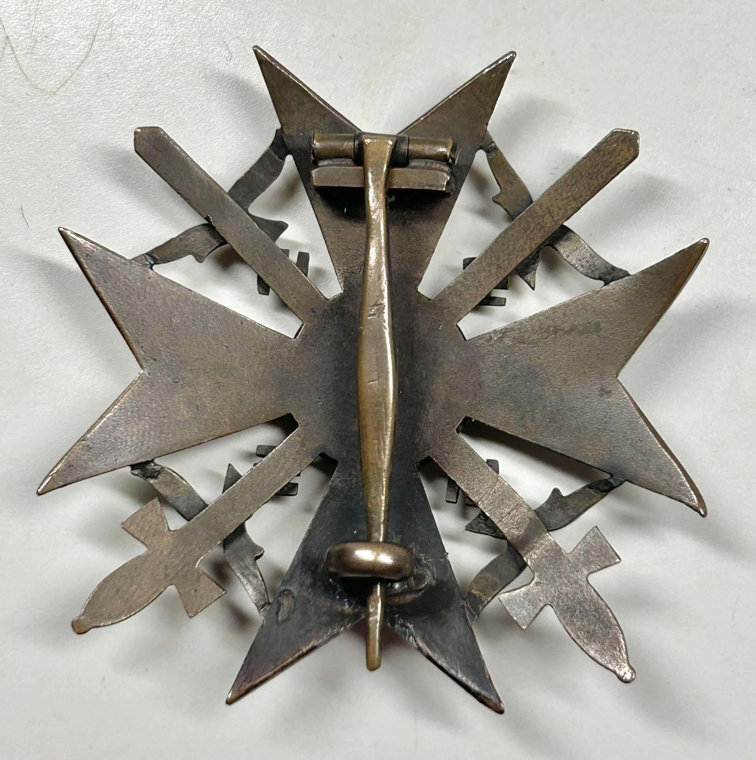 This is a very nice example of the Spanish Cross in Bronze Grade with Swords, one of 8,462 awarded by Germany. These were awarded to individuals involved in front line combat during the war. It is in very good condition with a lovely patina on the brass. There is no damage or repairs to the reverse hardware. This badge though unmarked was produced by Paul Meybauer, Berlin. Tombac construction with soldered on set up. Very good condition, no damage or repairs, untouched piece. Premium cross here!