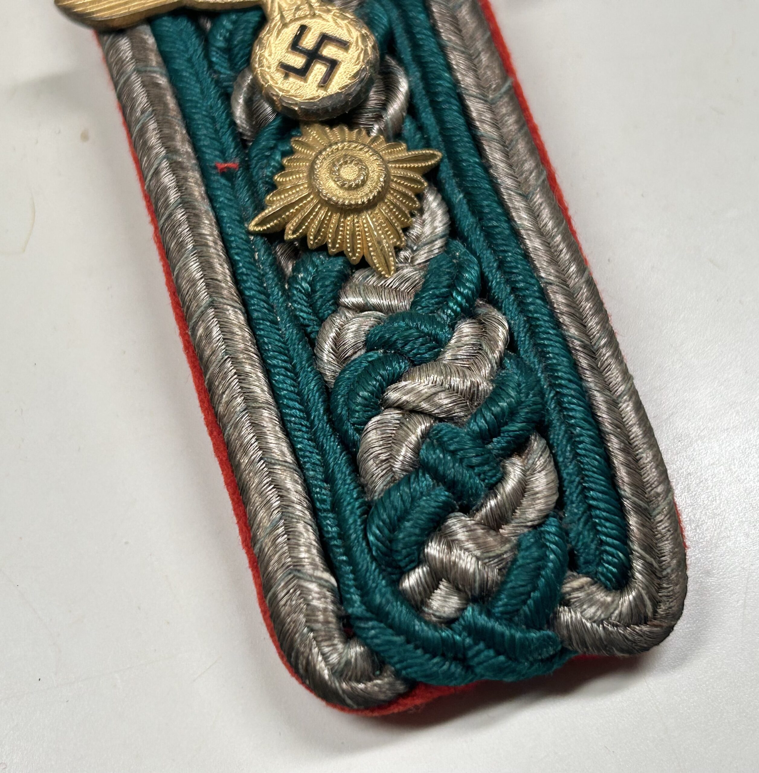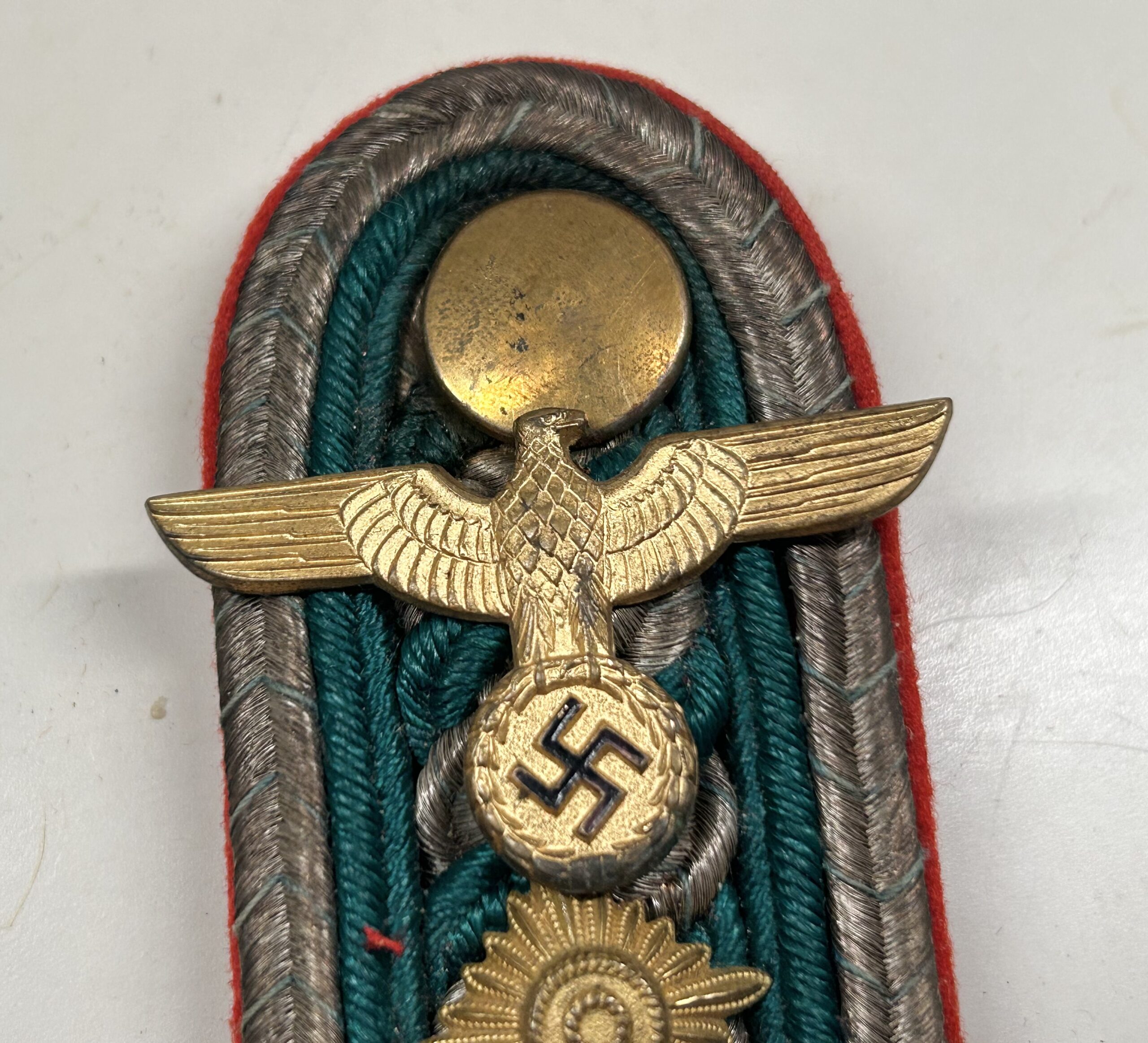 During the war U.S. veterans would mix and match different pieces of insignia as they saw fit with their war trophies. This piece was recently found in a large hoard of insignia brought home that I pulled directly from the woodwork. The base of this set is a simple shoulderboard as worn by a member of the Bavaria Landespolizei, the board has a rare early 1st pattern Heer (Army) gold eagle as worn on the visors of Generals, the eagle has a beautiful tone with polished highlights and was made of the highest quality. I did not want to take this set apart as it is how I pulled it from the group of items the veteran brought home, why this was done I am not sure but regardless it displays great and the cap eagle itself is very rare.
