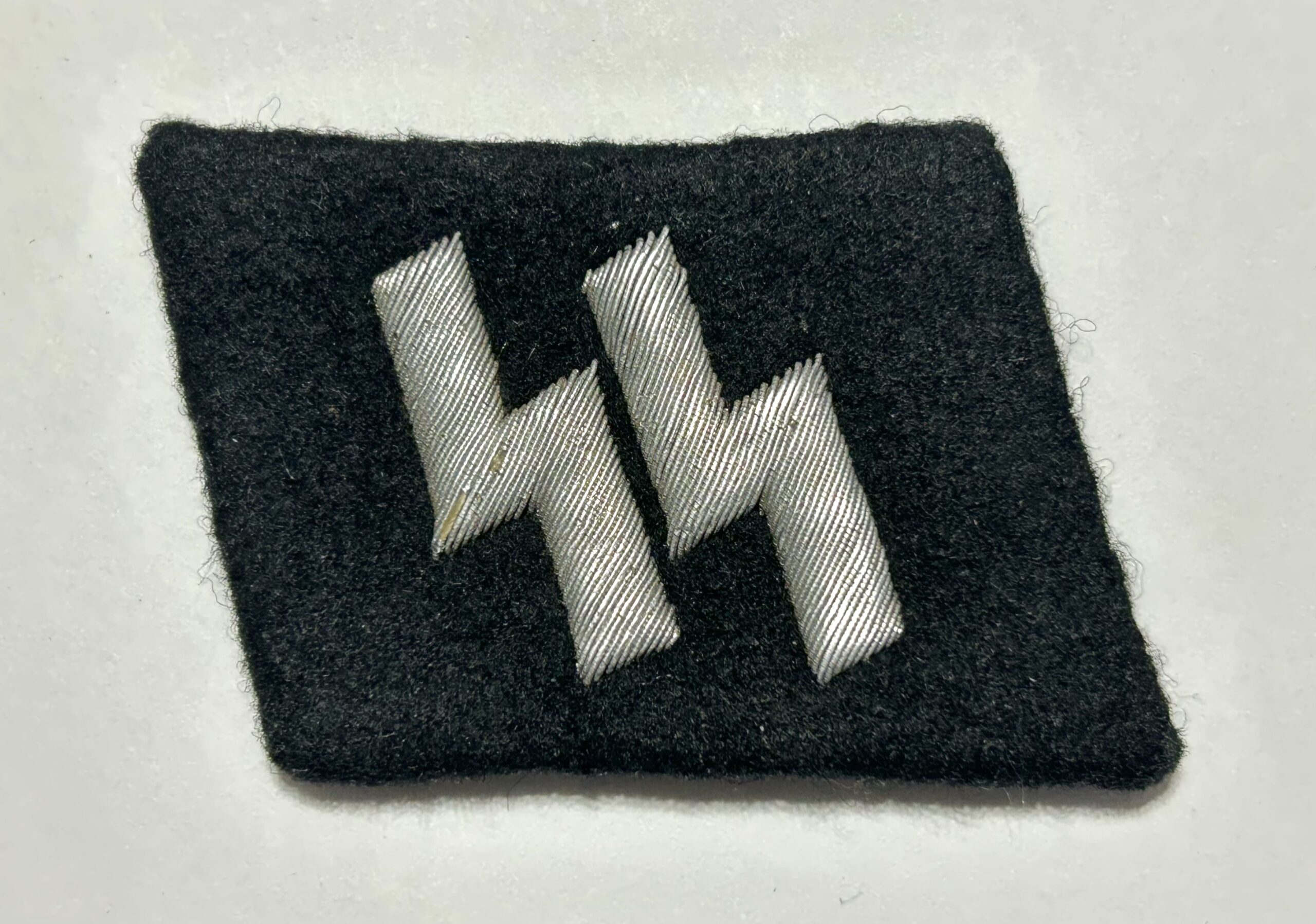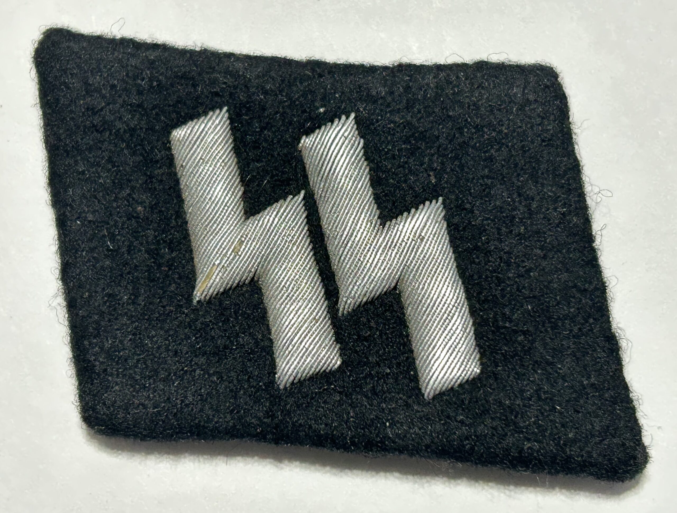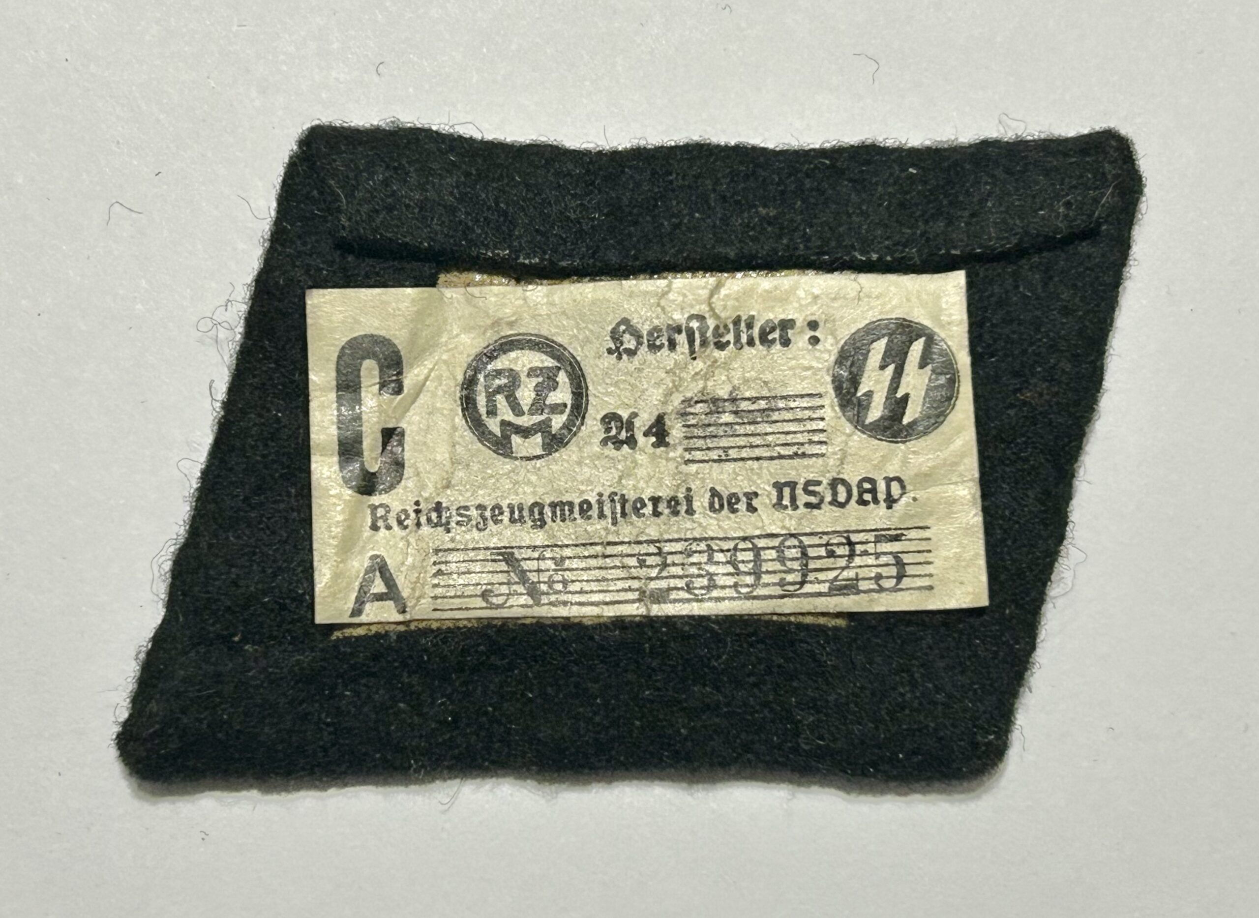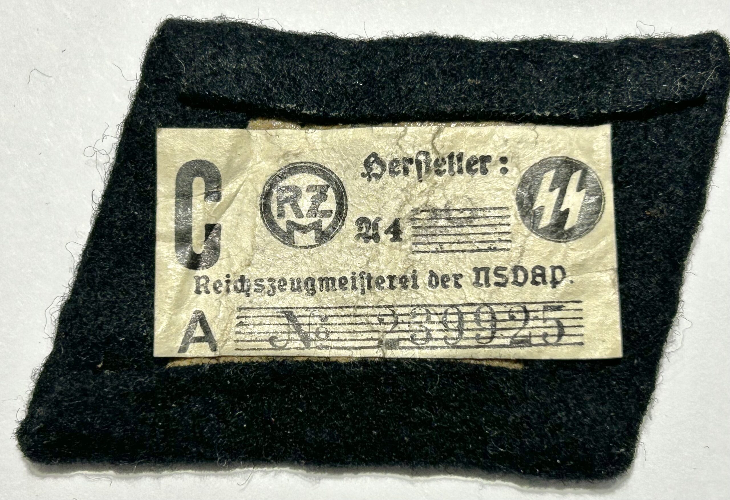 Textbook, mint example of a RZM pattern bullion collar tab with no silver edge piping as worn by Waffen-SS Non Commissioned Officers. Unissued and mint with the original paper tag in the reverse!