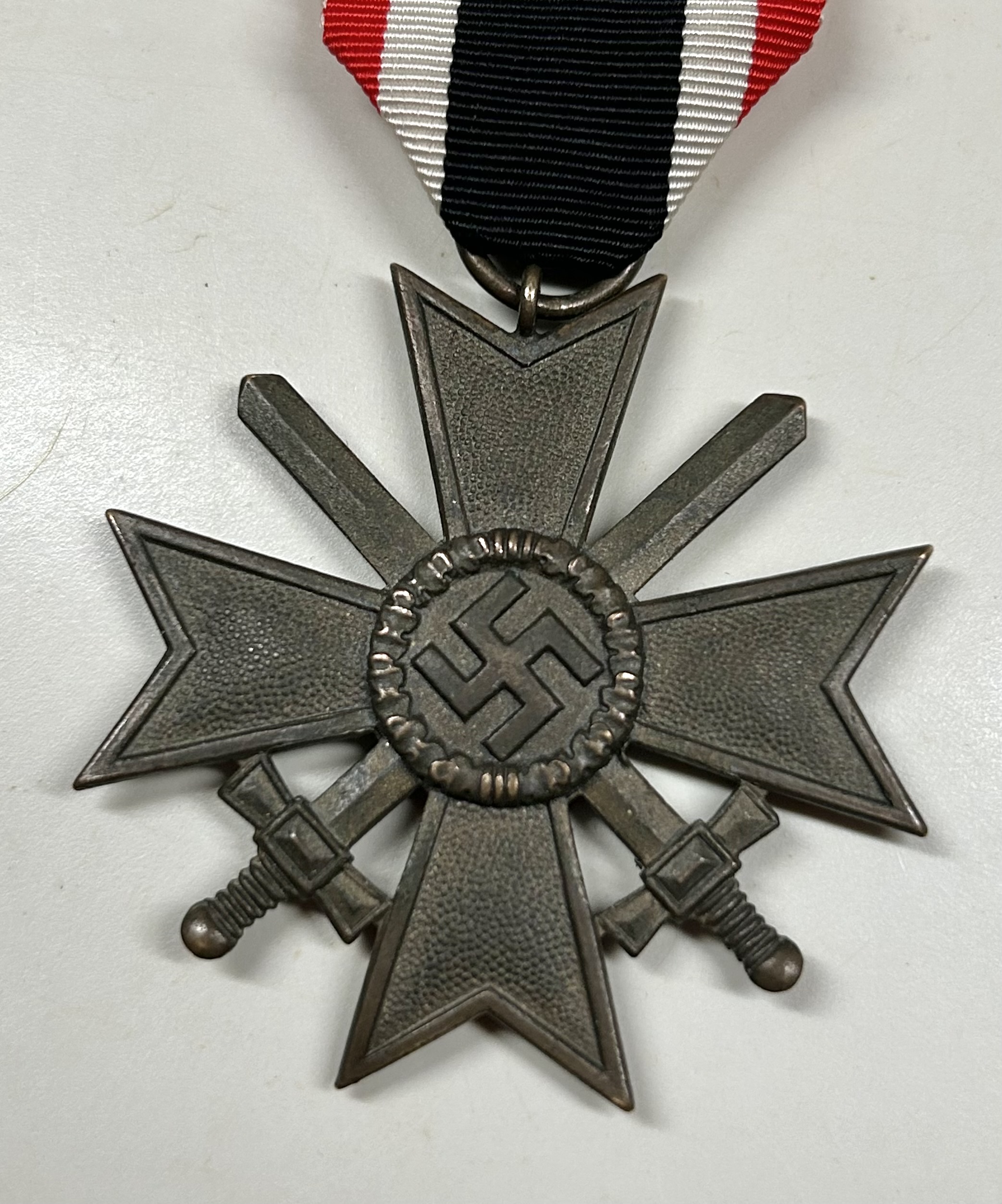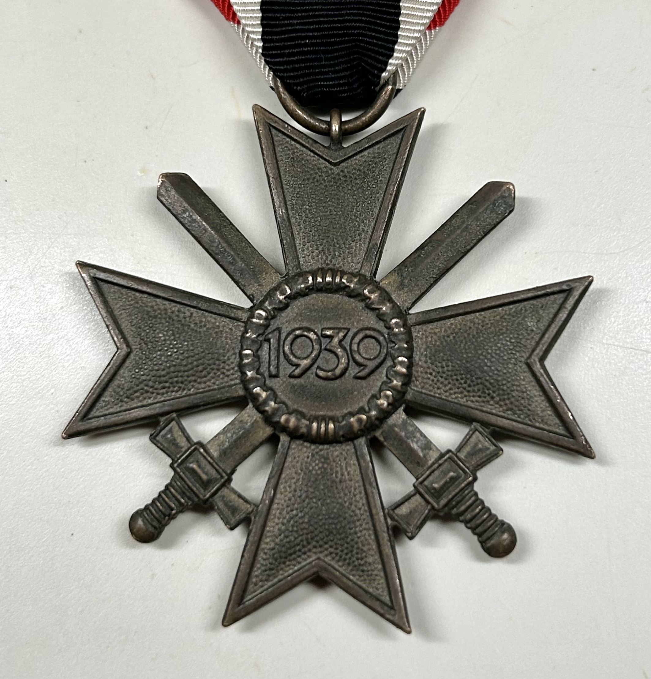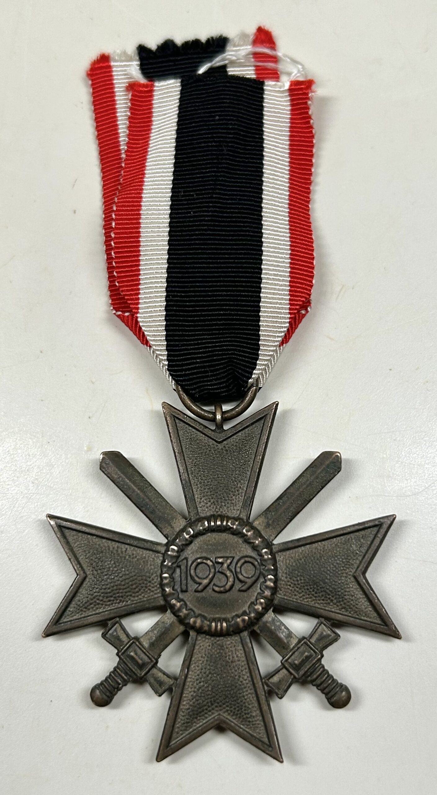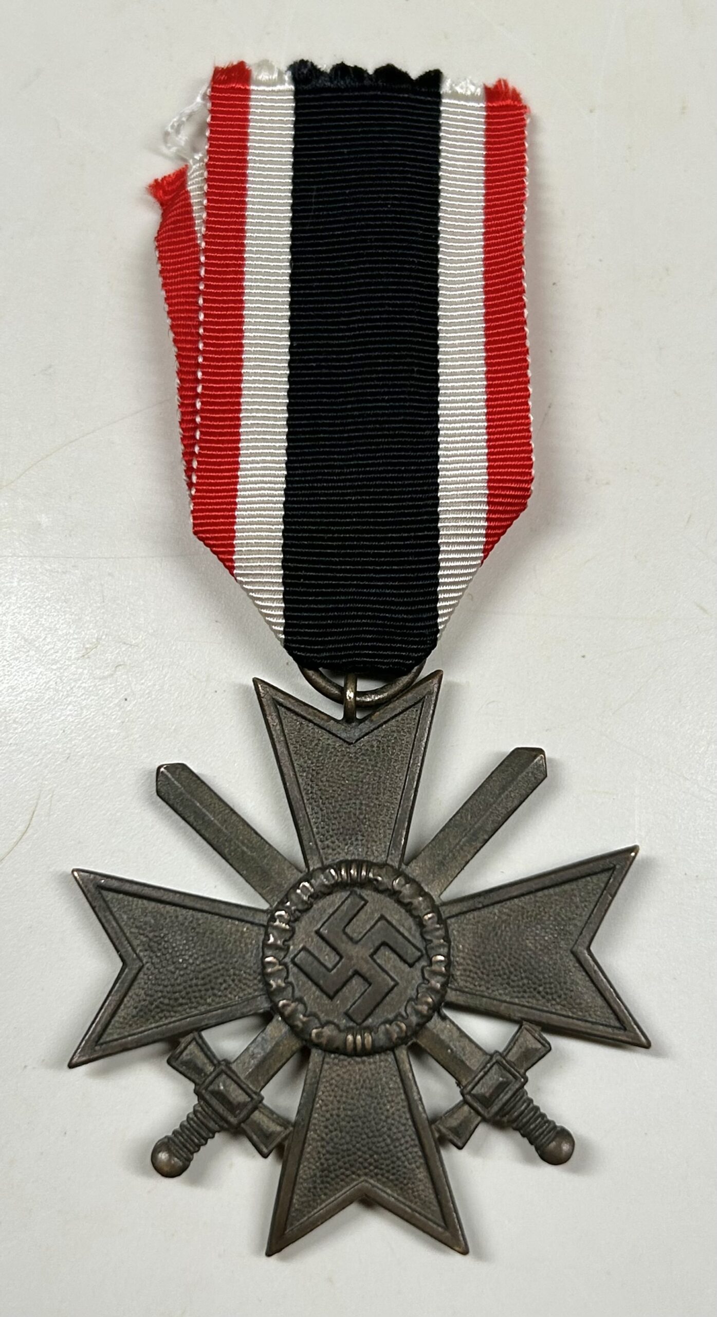 War merit cross 2nd class w/ swords. Early construction with large piece of original ribbon. Unissued condition. No repairs, no damage and a great amount of finish.